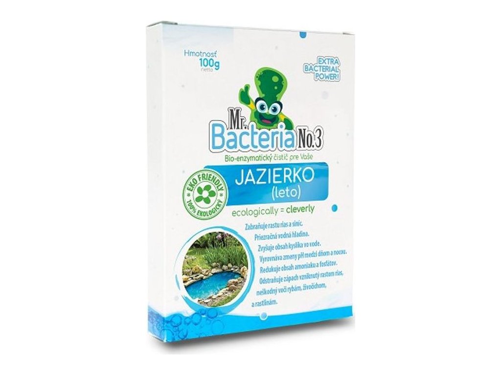 Mr.Bacteria No.3 je speciální biologický aktivátor určený k udržování čistoty a ekologické rovnováhy v zahradních jezírkách a rybníčcích. Obsahuje přírodní bakterie, které aktivně vyhledávají a rozkládají organické nečistoty ve vodě i na dně jezírka. Přípravek efektivně odstraňuje kal a zákal ve vodě , rozkládá organické usazeniny, čímž eliminuje hnědou a zakalenou vodu. Redukuje řasy a sinice tím, že bakterie rozkládají živiny podporující jejich růst, a zároveň snižuje fosfáty a chlorofyl A, čímž přispívá k dlouhodobě čisté vodě a udržuje ekologickou rovnováhu jezírka.