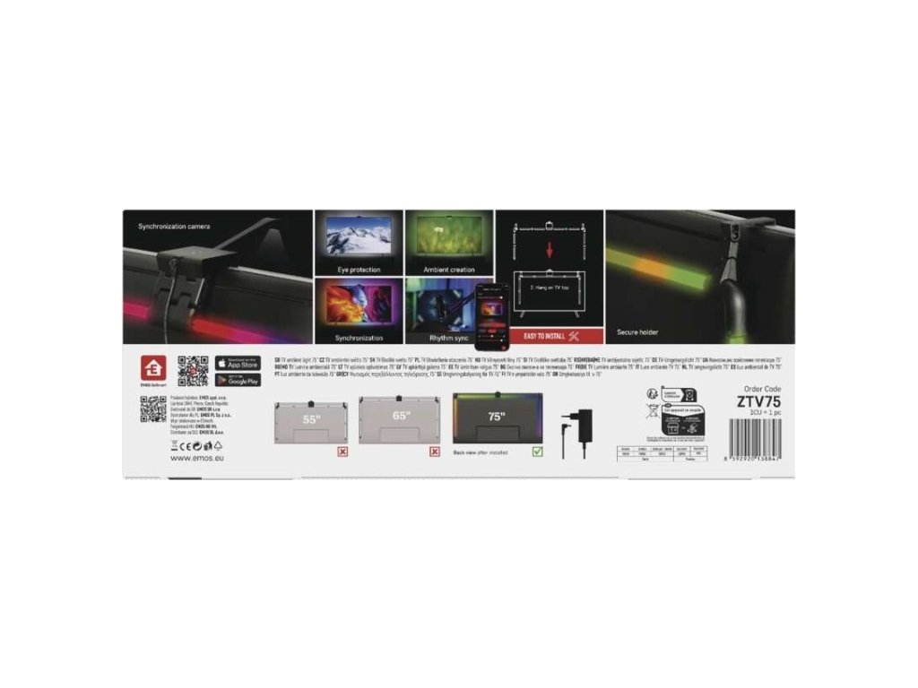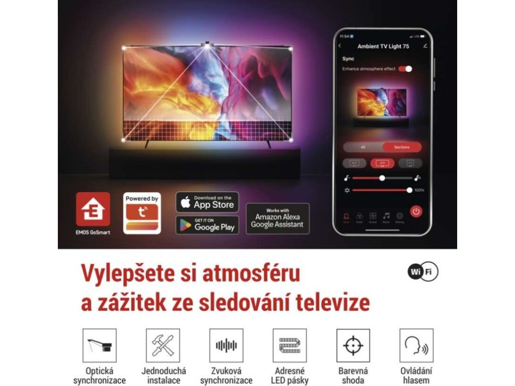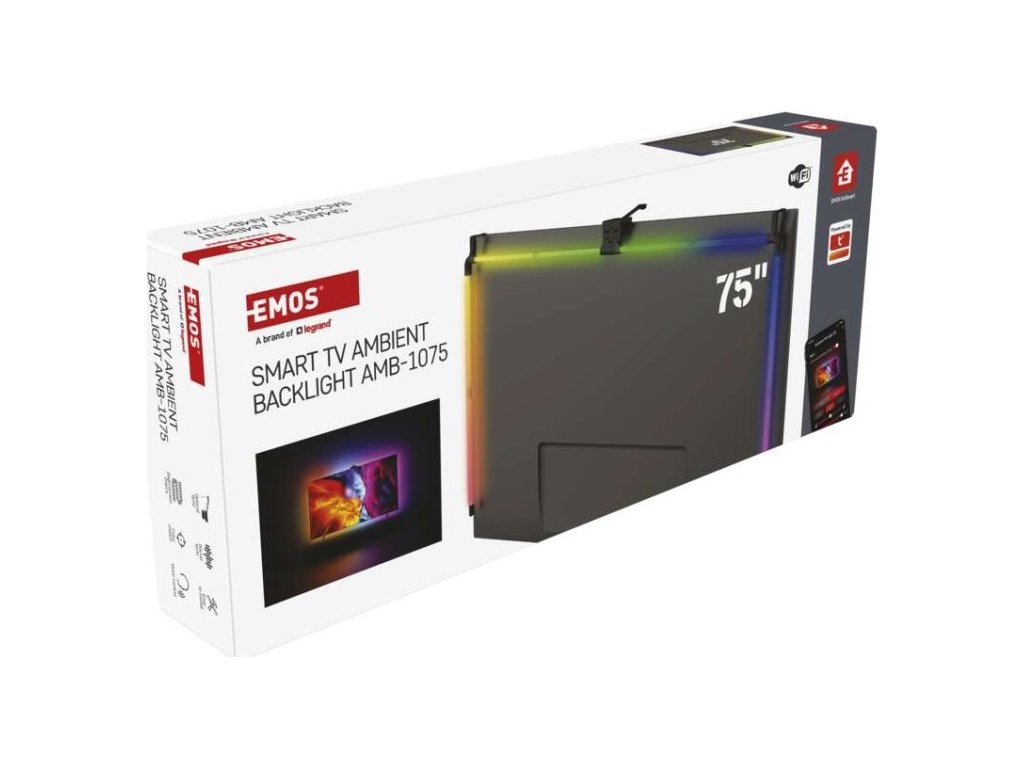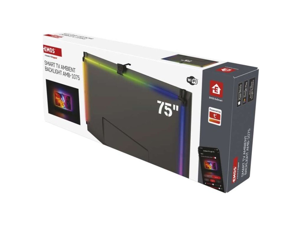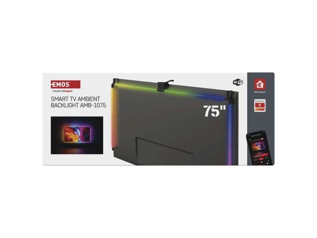 LED ambientní RGB GoSmart osvětlení EMOS ZTV75 za TV 75", světelný tok 660 lm, RGB barvy, HD synchronizační kamera, kompatibilita s hlasovými asistenty, ovládání přes aplikaci GoSmart (iOS/Android), Wi-Fi připojení. Příkon 24 W, délka přívodu 1,5 m.