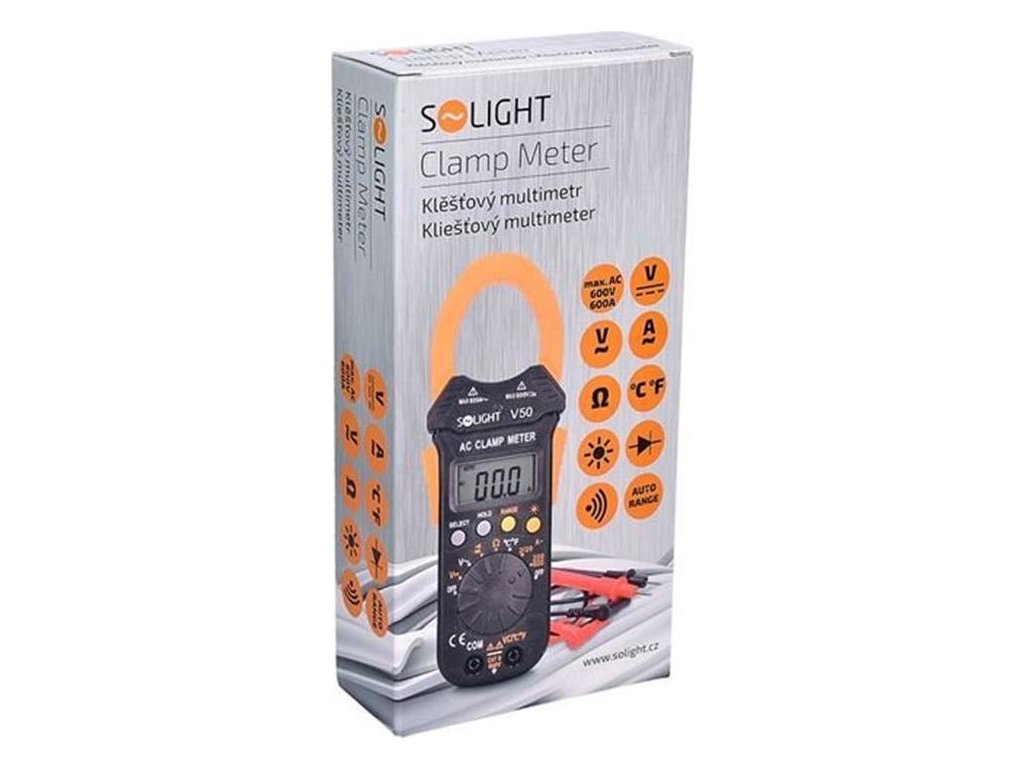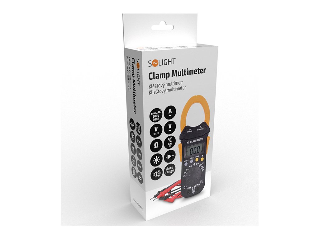 Automatické nastavení rozsahu, max. AC 600V/600A, max. DC 600V, odpor 20MOhm, teplota1370°C, test diody, bzučák, kleště 40mm