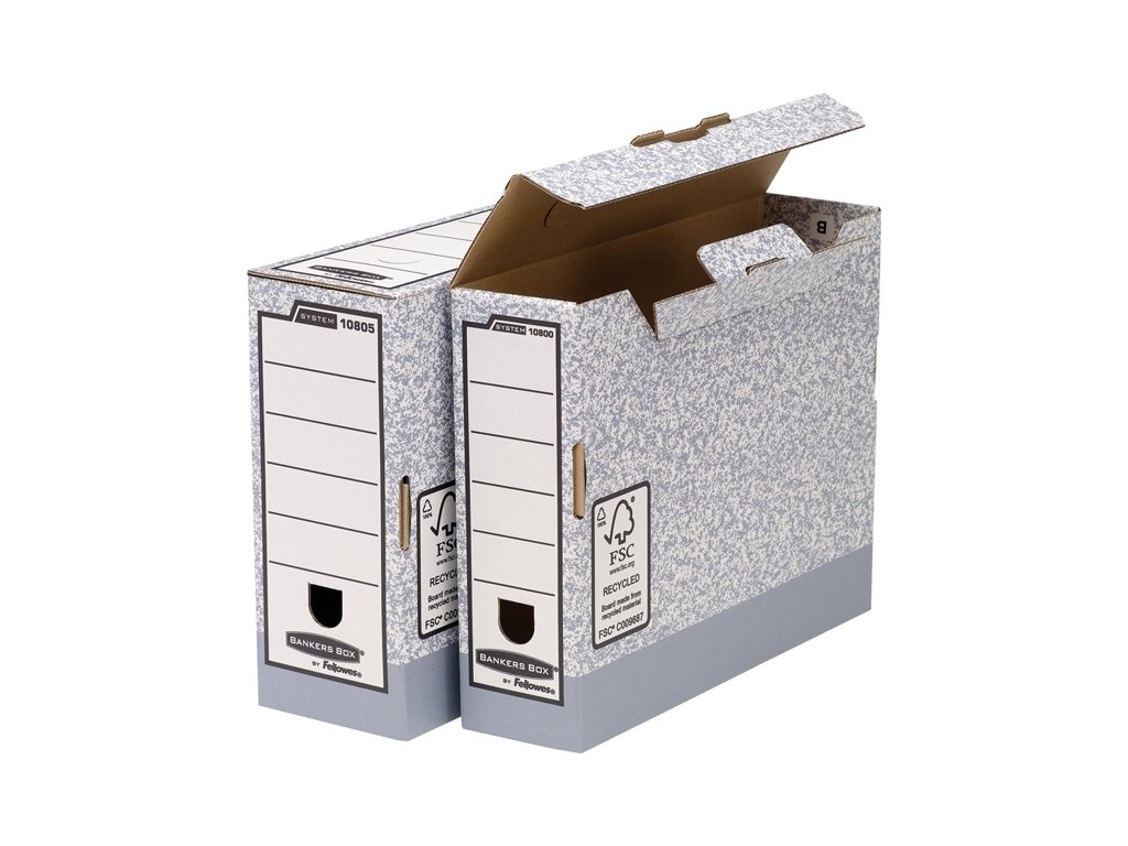 Produkt ze série Banker Box SYSTEM FSC ®. Velké etikety k popsání obsahu. Šíře hřbetu: 80 mm Vnější rozměry (š x v x h): 92 x 262 x 324 mm. Vnitřní rozměry (š x v x h): 85 x 258 x 310 mm. Automatický systém skládání FastFold ® usnadňuje a urychluje složení. Dodávané balení je v rozloženém stavu, balené po 10 ks. Ekologický výrobek, který je vyrobený ze 100% recyklovaného materiálu, vhodný k další recyklaci a opatřený FSC certifikátem.