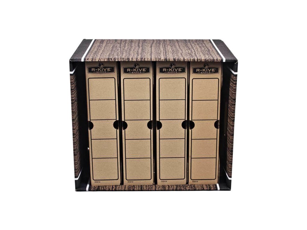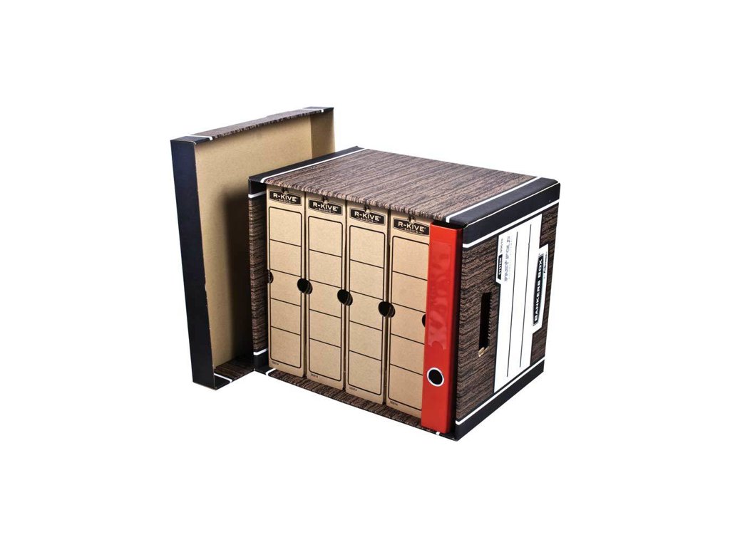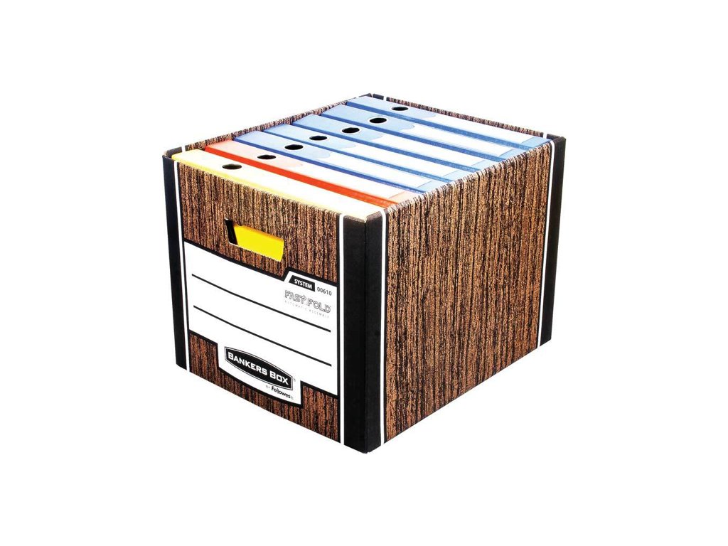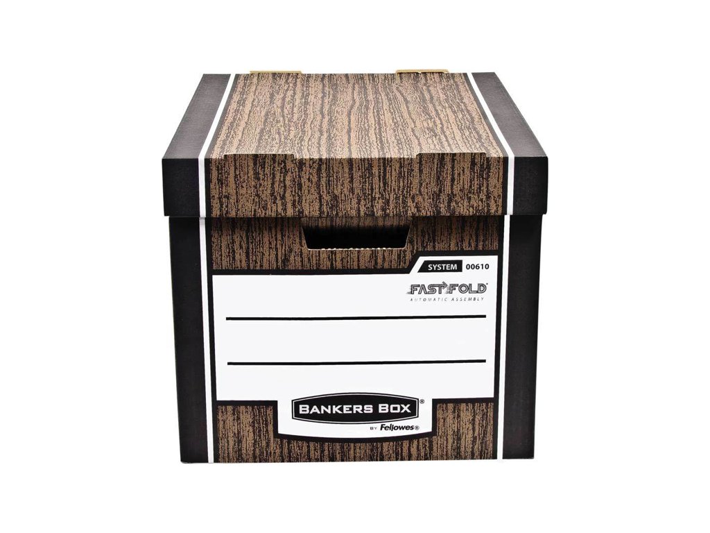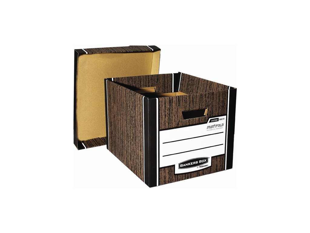 Série Bankers Box WOODGRAIN. Výhodou je snadné skládání - systém FastFold® umožňuje složení během několika vteřin. Vyrobena z tlusté vlnité lepenky s dvojitým systémem bočních stěn, otvory na bocích pro snadné přenášení. Velké etikety k popisu obsahu na čelní straně. Odklápěcí víko. Vnější rozměry (šxvxh): 340 x 295 x 405 mm, vnitřní rozměry (šxvxh): 325 x 285 x 385 mm. Barva hnědá / imitace dřeva. Baleno po 2 ks. Dodáváme v rozloženém stavu.