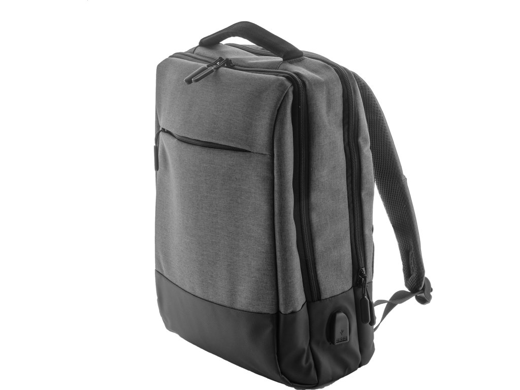 Dvoubarevný batoh s více přihrádkami na zip, uvnitř mnoho kapes, s polstrovanou přihrádkou na notebook (17 "), ergonomickými zády a ramenním popruhem. S kapsou na ochranu proti krádeži, popruh na vozík a vestavěné připojení USB pro power banky. 400D polyester.