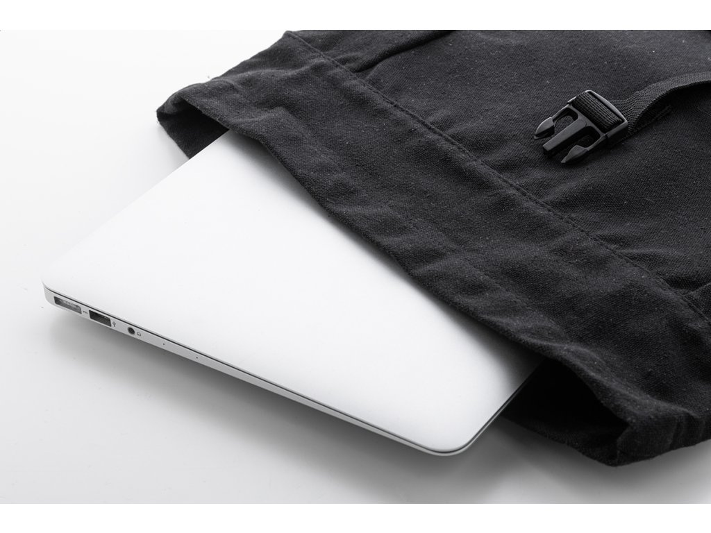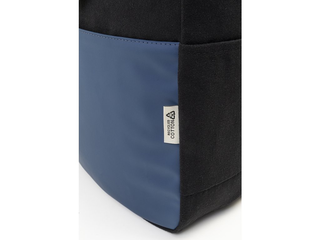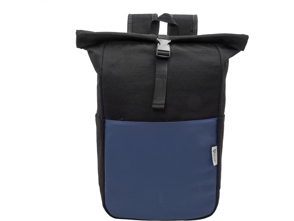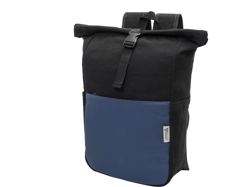 Rolovací batoh z recyklovaného plátna se zapínáním na přezku a přední kapsou na zip z měkké recyklované PU kůže. S polstrovanou přihrádkou na notebook (15"), bočními kapsami, polstrovanými zády a ramenními popruhy. 70% recyklované bavlny a 30% RPET polyesteru. S výrazným štítkem z recyklované bavlny.