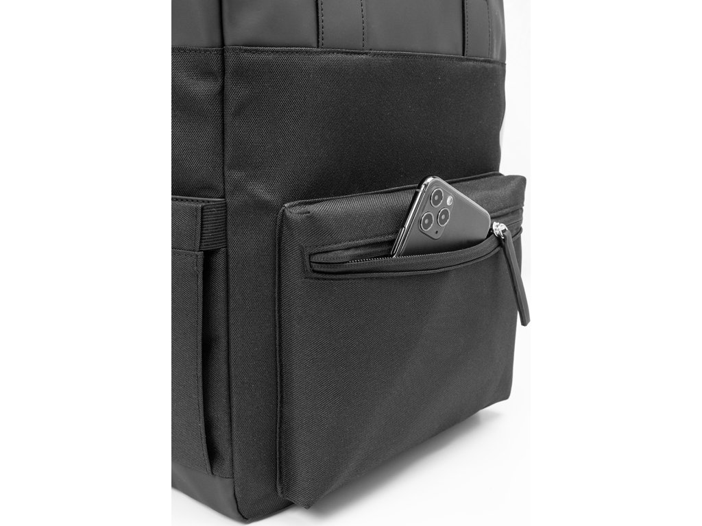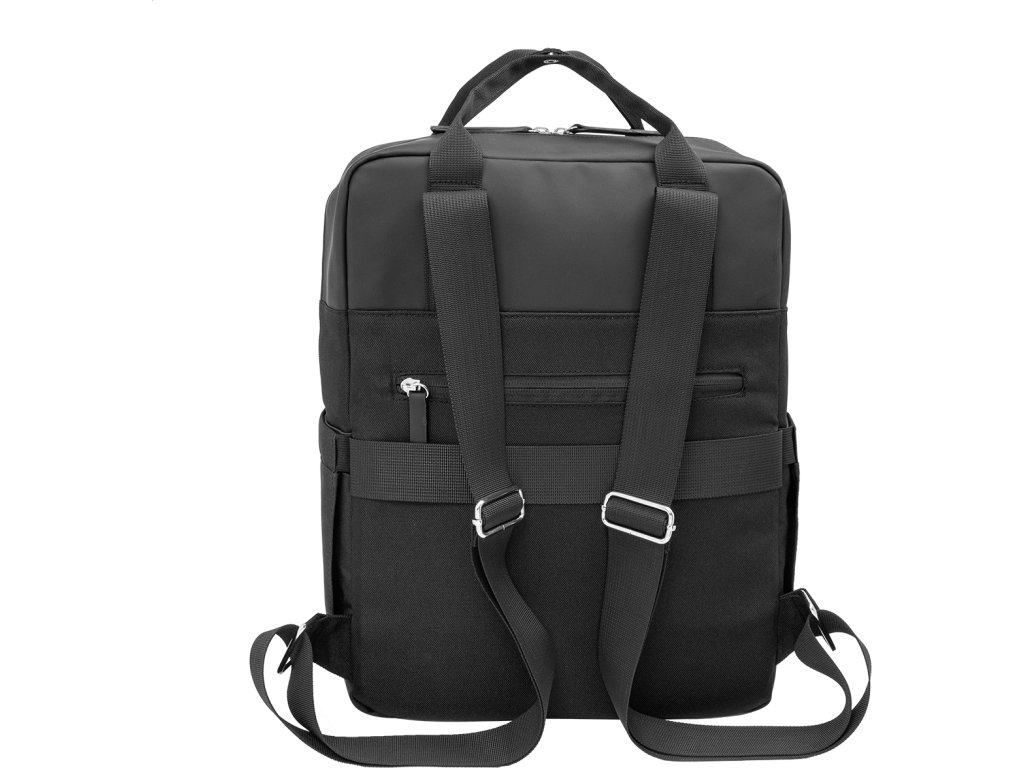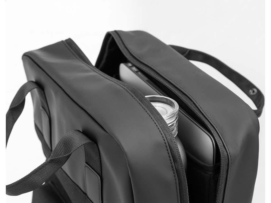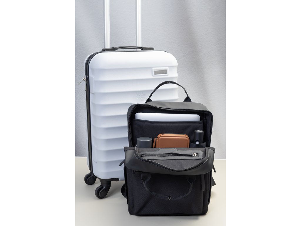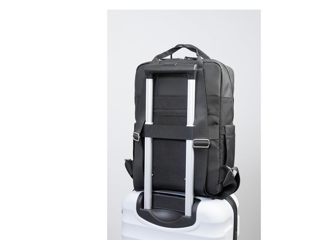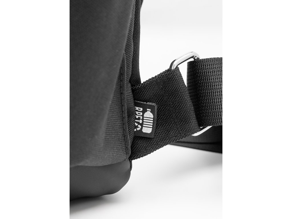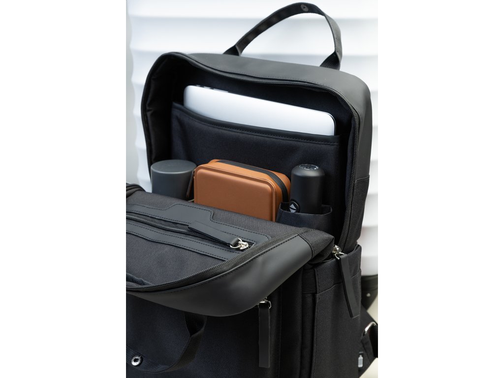 Batoh z RPET s měkkým vrškem z PU kůže, přihrádkou na zip, přední kapsou na zip, bočními kapsami a kapsou proti krádeži. S popruhem na kolečkách, polstrovanými zády a přihrádkou na notebook (15"). 900D RPET polyester s výraznou nálepkou RPET. V netkaném protiprachovém pytlíku z RPET.