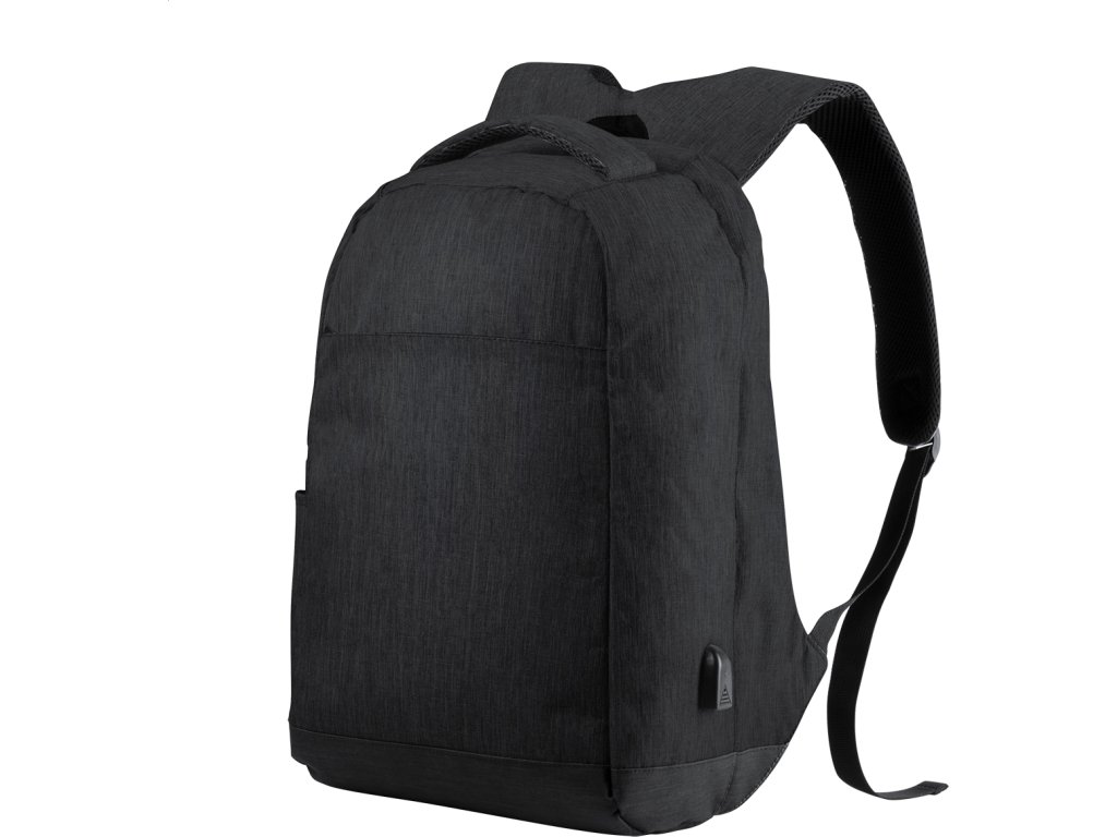 Voděodolný batoh s ochranou proti krádeži s několika přihrádkami na zip, polstrovaným prostorem pro laptop (15 ") a tabletem (12"), polstrovanými zády a ramenním popruhem. S vestavěným USB připojením pro power banky. 300D Polyester.