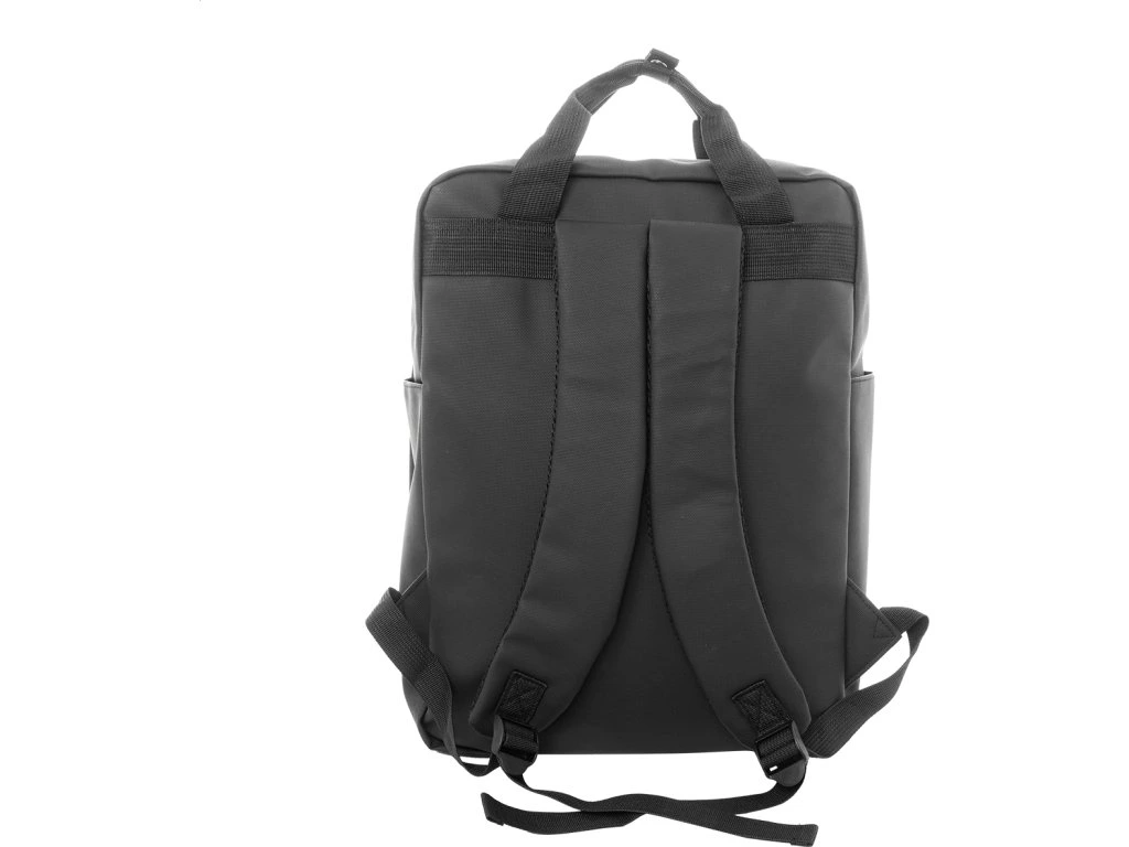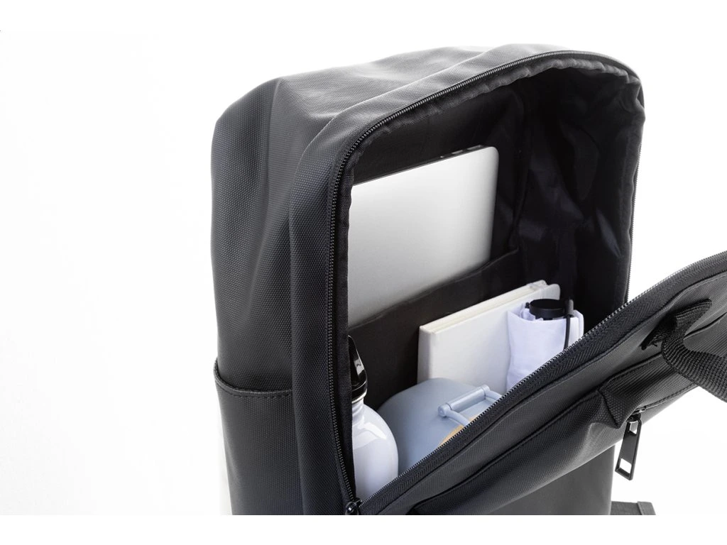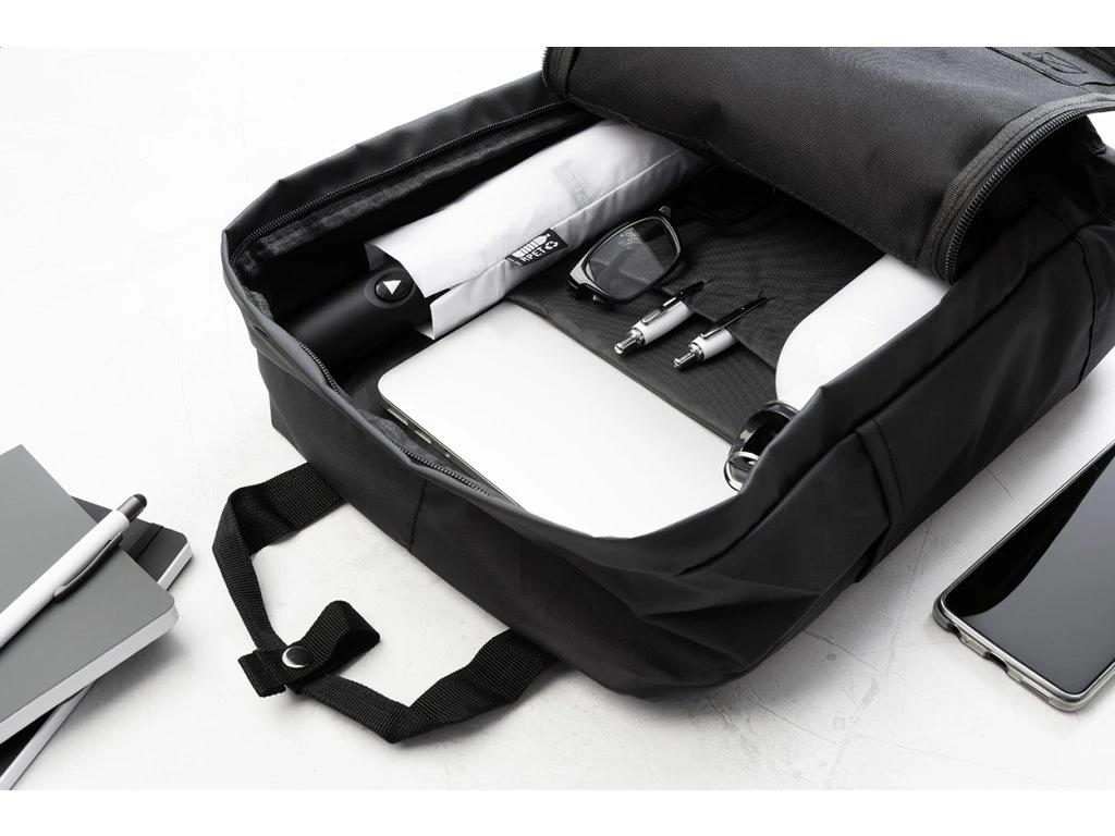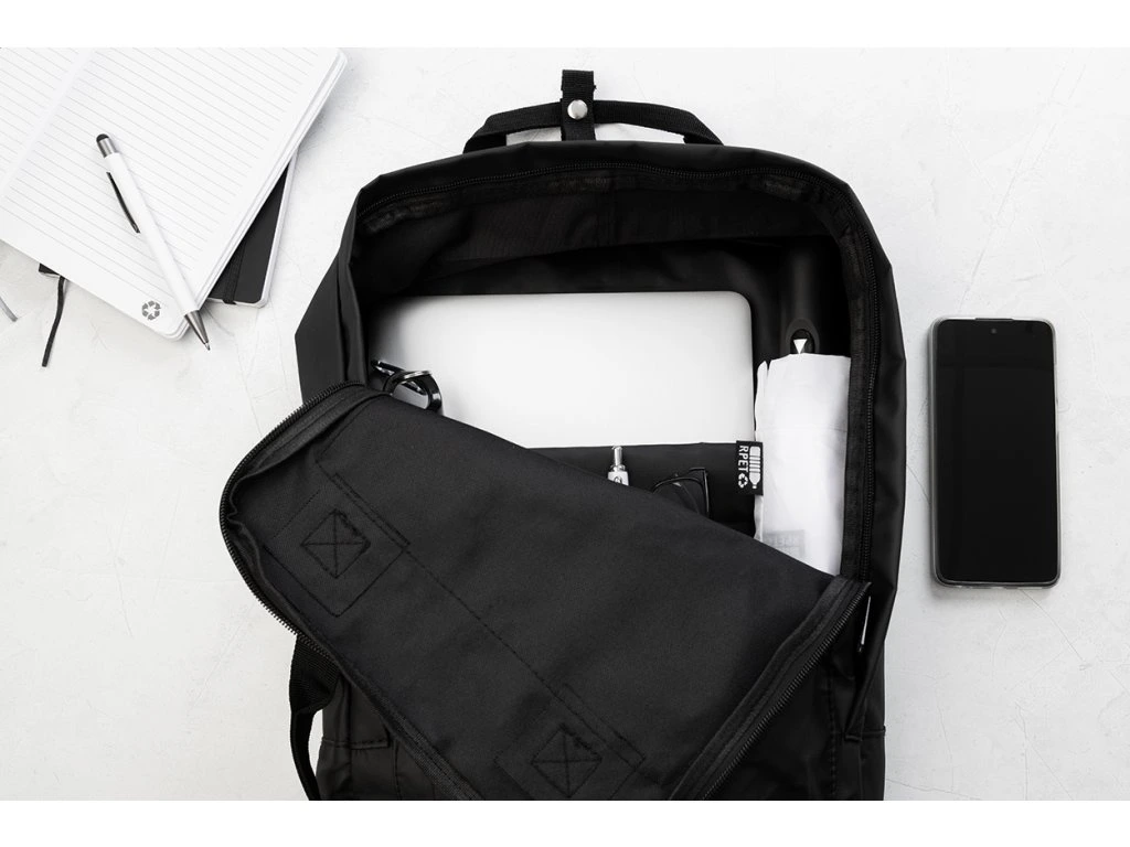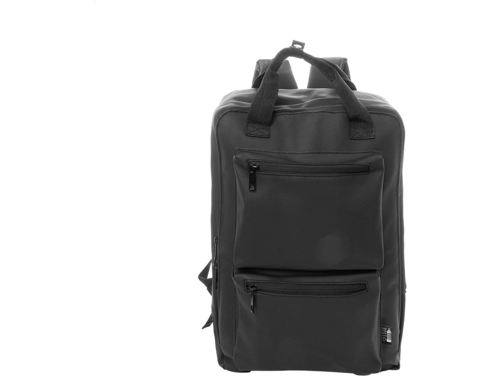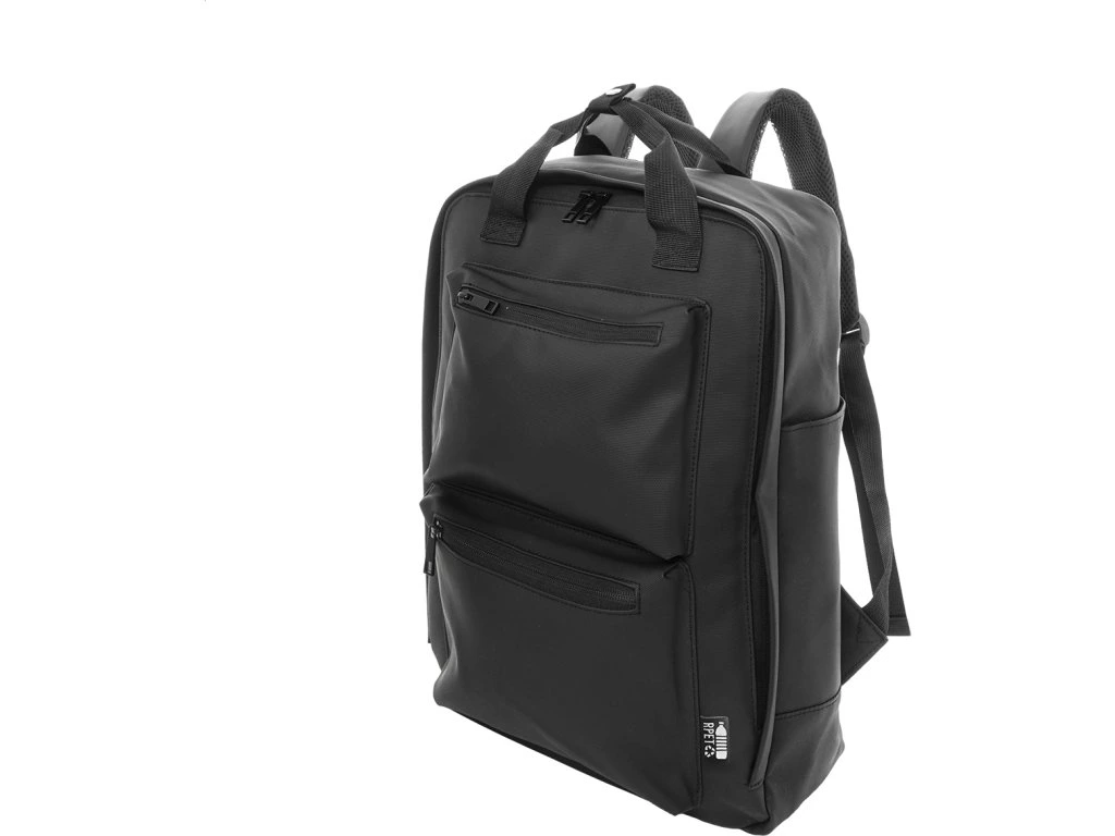 Voděodolný batoh z RPET s hlavní přihrádkou na zip, 2 předními kapsami na zip, bočními kapsami a polstrovanou přihrádkou na notebook (15") a tablet (10"). S polstrovanými zády a ramenními popruhy. Polyester RPET 600D potažený PU, s výrazným štítkem RPET.