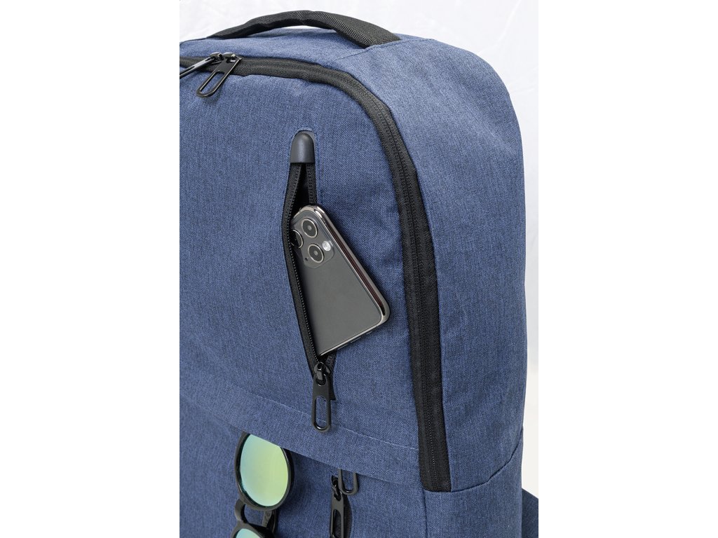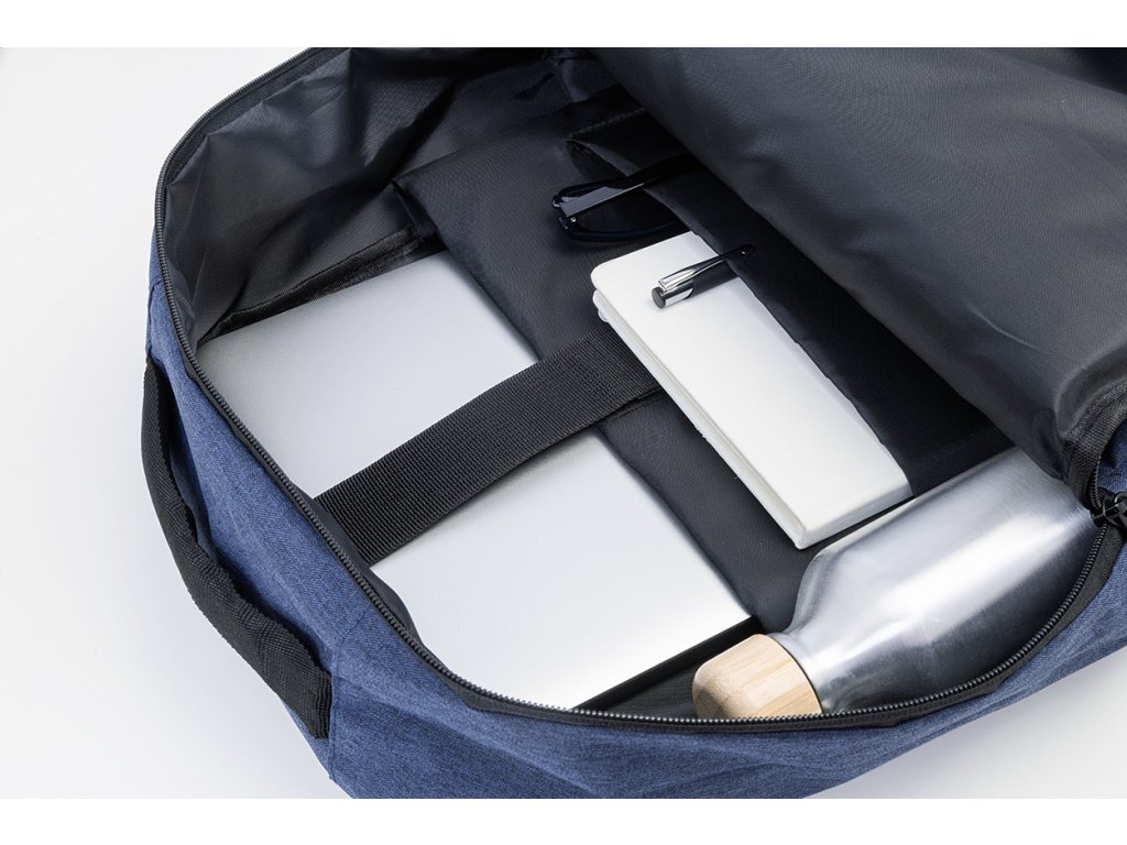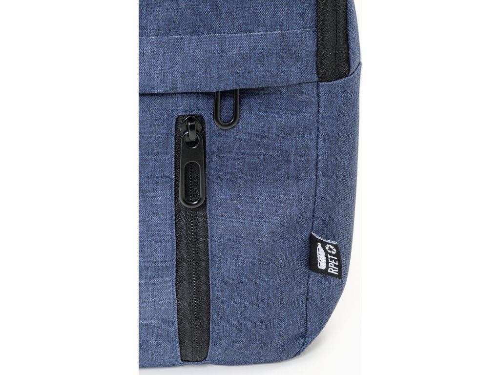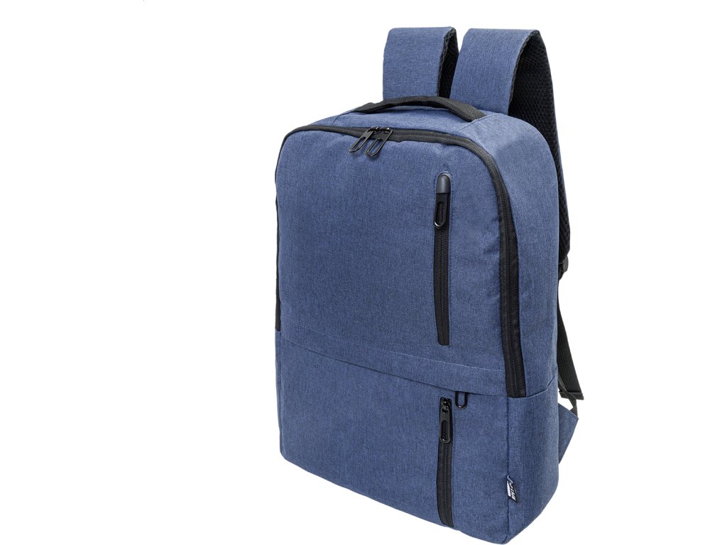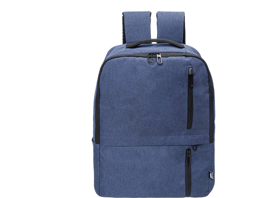 RPET batoh s hlavní přihrádkou na zip a 3 předními kapsami na zip. S polstrovanými přihrádkami na tablet (10") a notebook (15"), polstrovanými zády a ramenními popruhy. 600D RPET polyester s výrazným štítkem RPET.