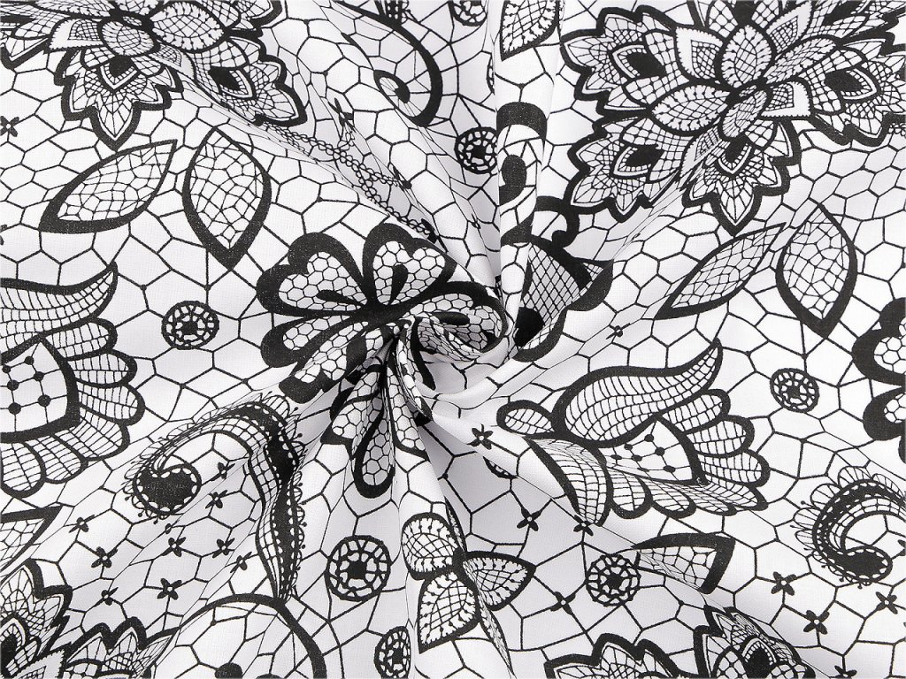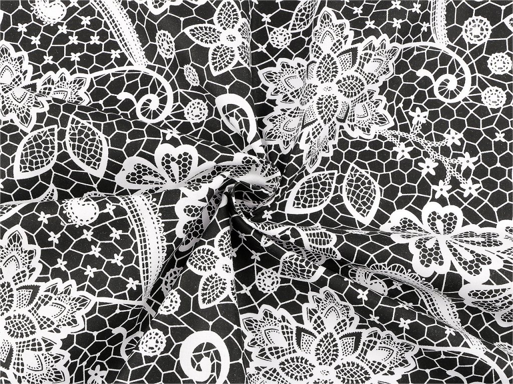 Bavlněnou látku s krajkovým motivem využijete na šití povlečení, polštářů, pytlíků, závěsů, tašek a dalších doplňků. Černobílý vzor přináší do vašeho domova kontrast a styl, který je snadno kombinovatelný s ostatními prvky bytového vybavení. Pokud jste kreativní, můžete si motivy na látce vymalovat barvami a fixy na textil nebo je použít jako předlohu pro vyšívání.