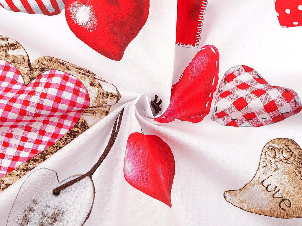 Bavlněnou látku využijete na šití ubrusů, povlečení, zástěr, polštářů či tašek a pytlíků. Dekorativní vzor se srdíčky v různých designech a stylizacích přidá do vašeho domova nádech romantiky a útulnosti. Je vhodná i na valentýnské kreativní projekty.