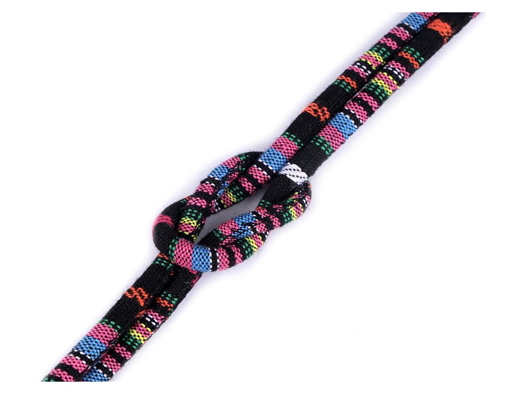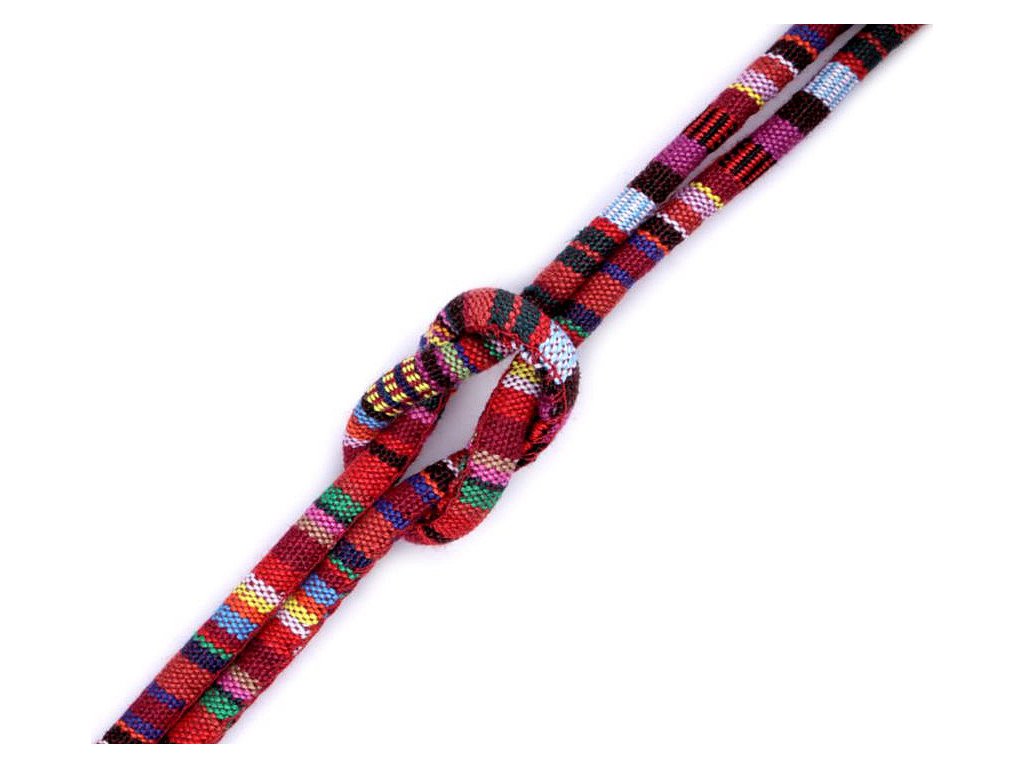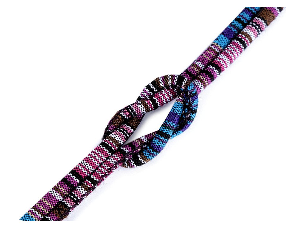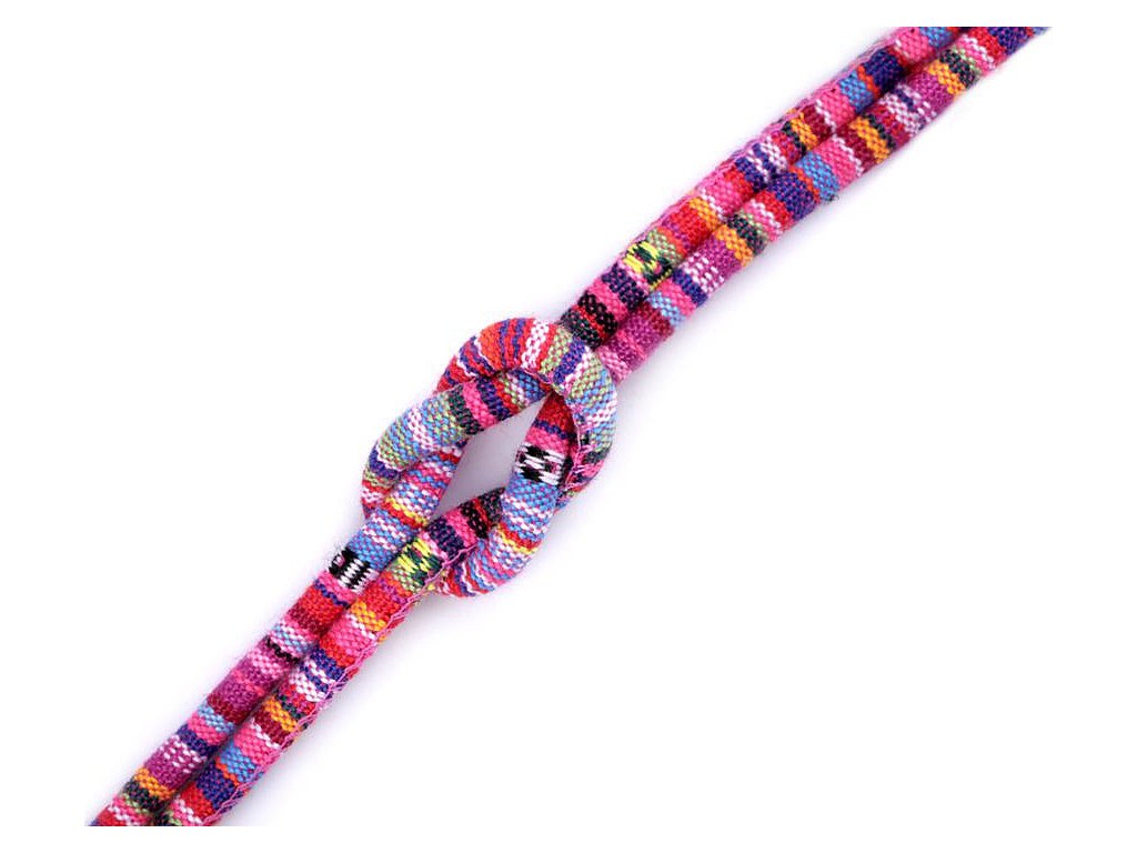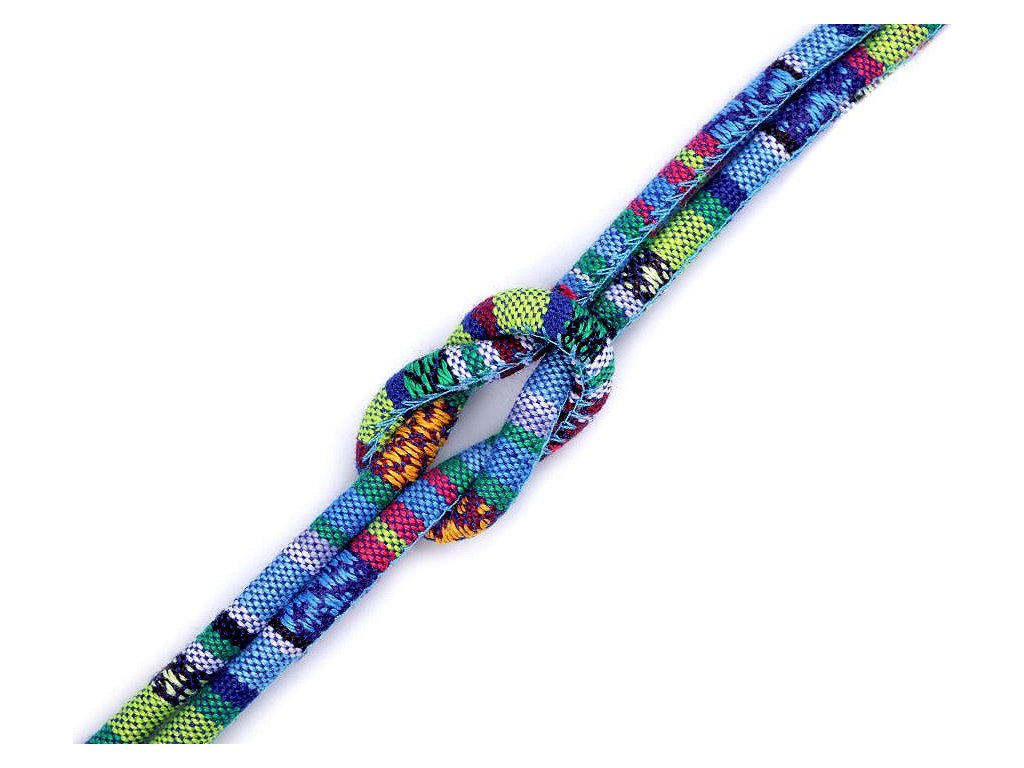 Barevnou šňůru s indiánským motivem a výplní využijete do tunýlků mikin, kalhot nebo bund, nebo jako nevšední ozdobu oděvů či obuvi. Vytvoříte z něj jednoduchý trendy pásek, náhrdelník či náramek. Šňůra je pevná, skvěle se tak uplatní při výrobě vaků na záda nebo tašek.
