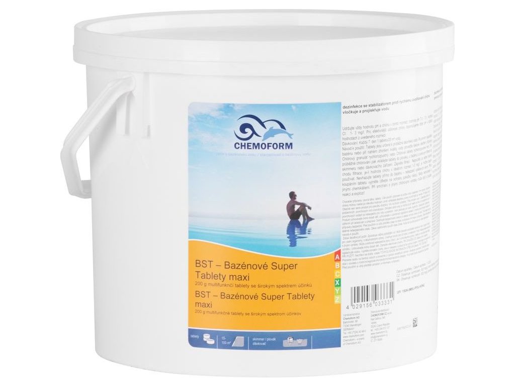 Tablety s vícenásobným účinkem. Jsou složeny ze tří hlavních složek - chlorová dezinfekce, algicidní látka a vločkovače. Vhodné pro dlouhodobou údržbu bazénů.