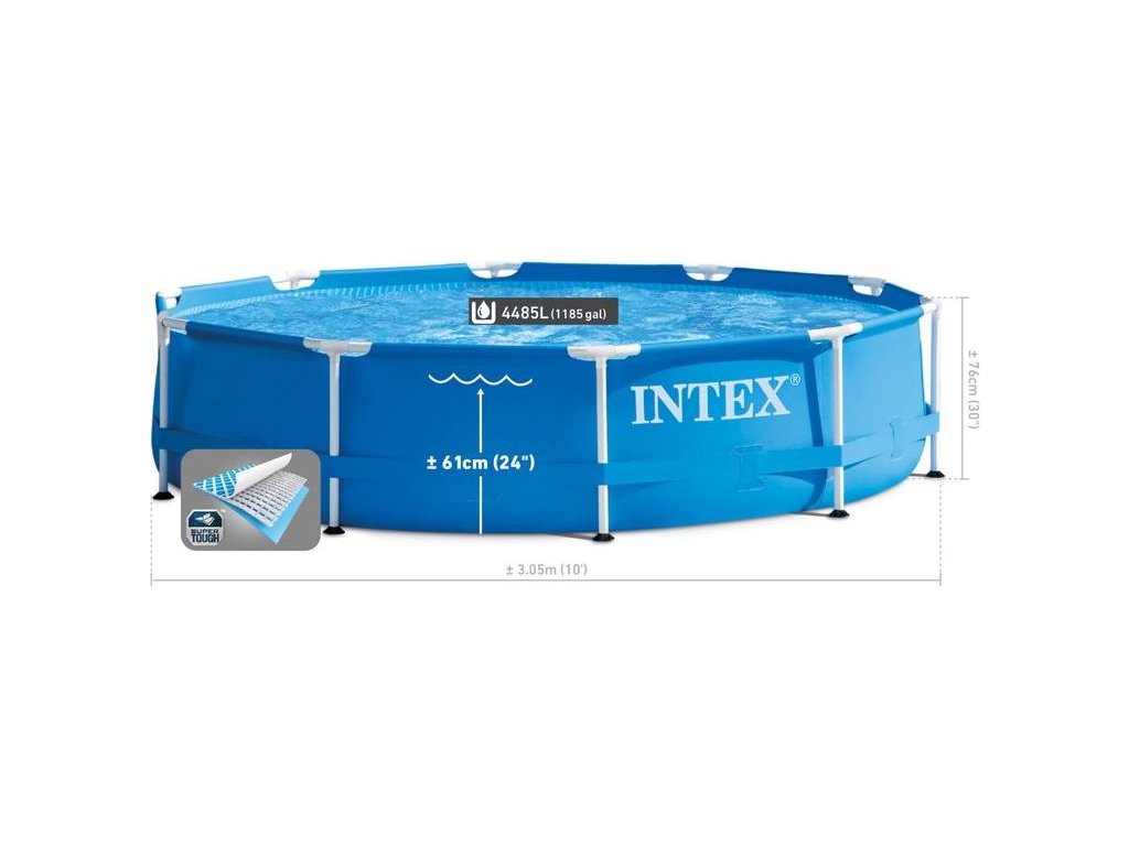 Užijte si hodiny venkovní zábavy s bazénem Intex® Metal Frame™ 28202 o rozměrech 3,05x0,76m . Je vyroben z 3-vrstvého odolného materiálu SUPER-TOUGH® odolného proti propíchnutí. Pozinkovaná konstrukce s práškovým nástřikem zajišťuje vysokou odolnost. Technologie Hydro Aeration® poskytuje zlepšenou cirkulaci a filtraci, zlepšenou čirost vody a zvýšený počet záporných iontů na vodní hladině. Kapacita vody je 4 485 litrů (90 %).