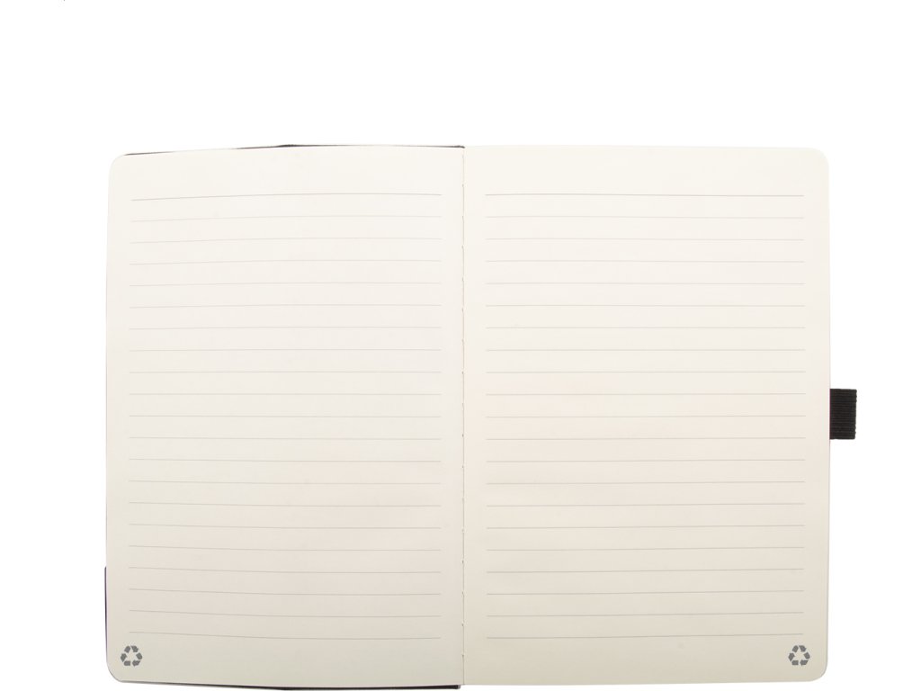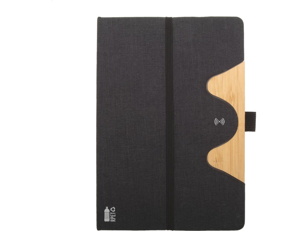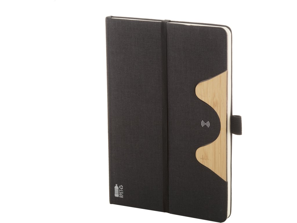 Blok A5 potažený polyesterem RPET s bambusovou vložkou, funkcí stojánku na mobil a vestavěnou bezdrátovou rychlonabíječkou (15W). S 80 linkovanými listy z recyklovaného papíru. Včetně USB nabíjecího kabelu.