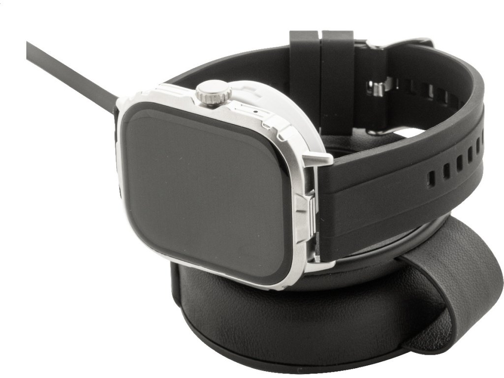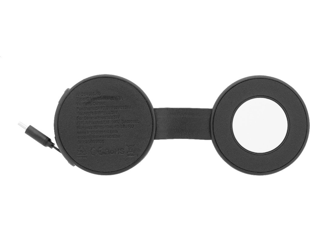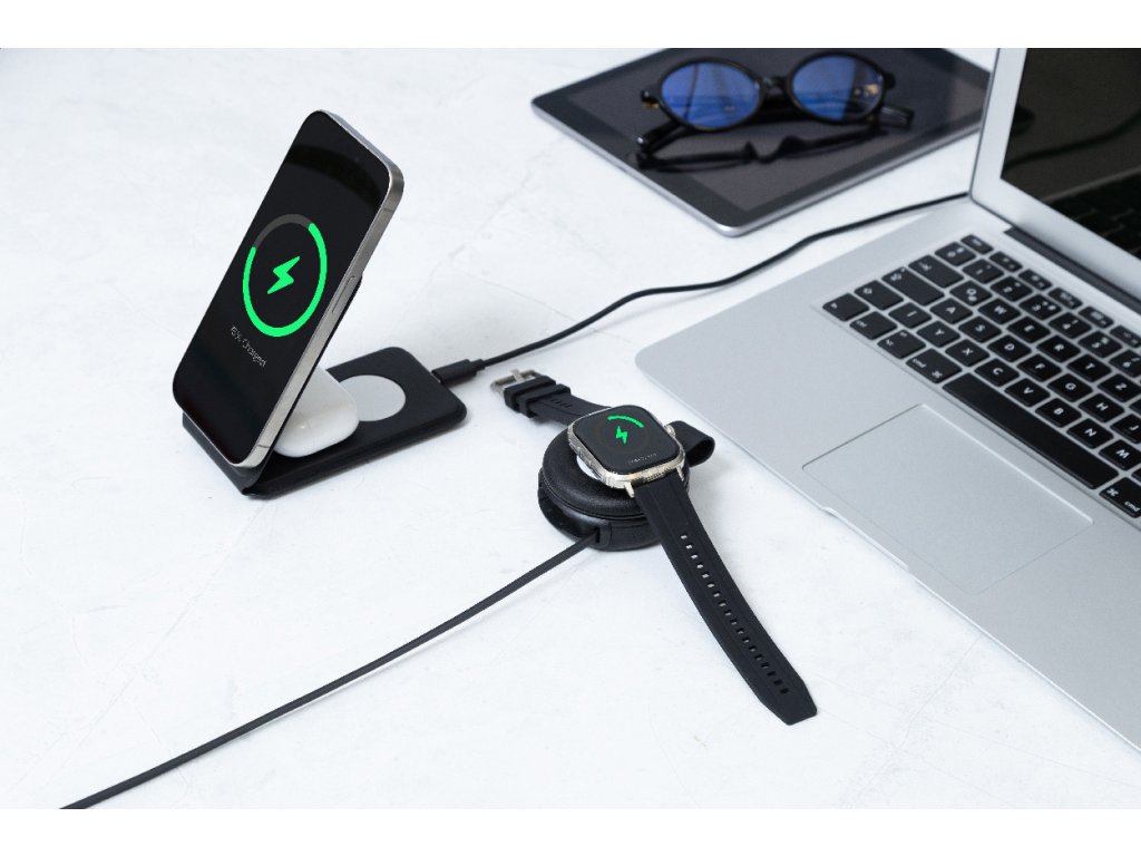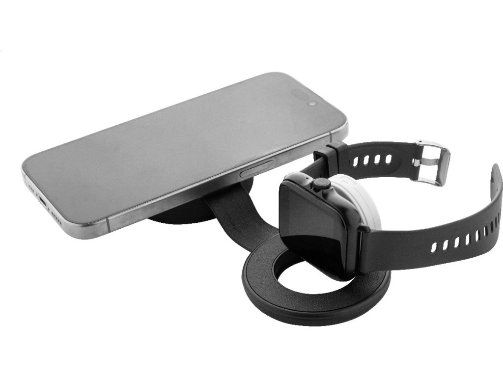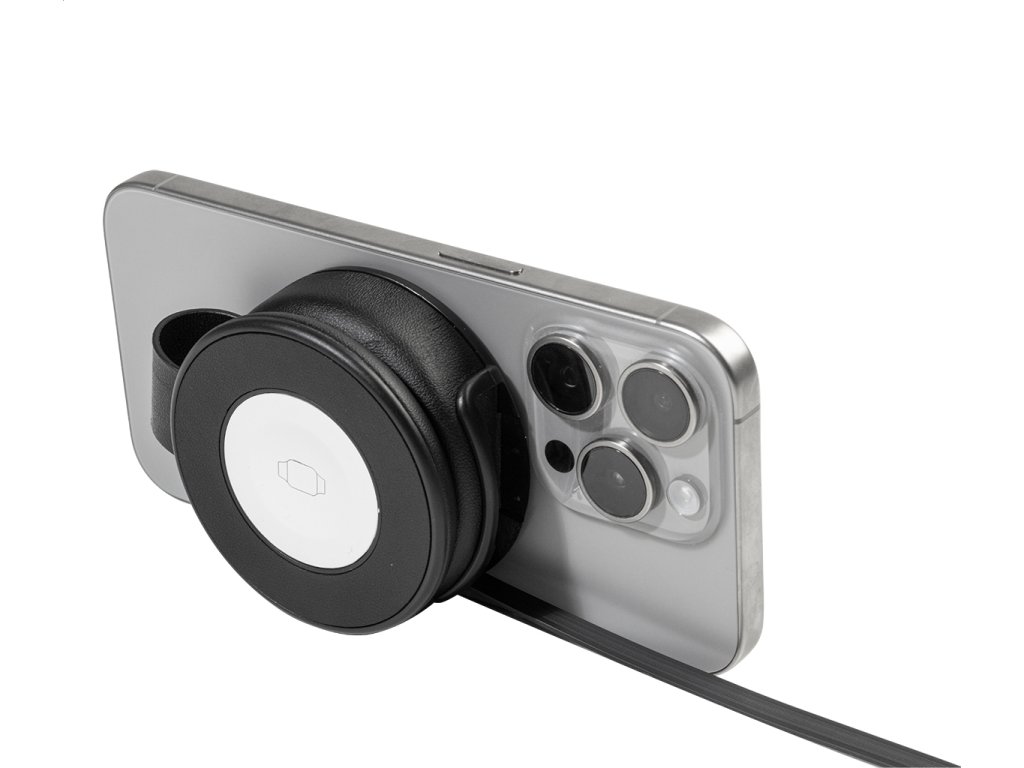 Luxusní skládací bezdrátová nabíjecí sada z recyklované PU kůže s magnetickou bezdrátovou rychlonabíječkou (15 W), sekundární bezdrátovou nabíječkou (2,5 W) pro chytré hodinky (Apple® a Samsung®) a vestavěným teleskopickým nabíjecím kabelem USB-C. Včetně samolepicího kovového kroužku pro použití magnetické funkce na jakémkoli bezdrátově nabíjecím zařízení. Kompatibilní s iPhone® 12 nebo novějším.