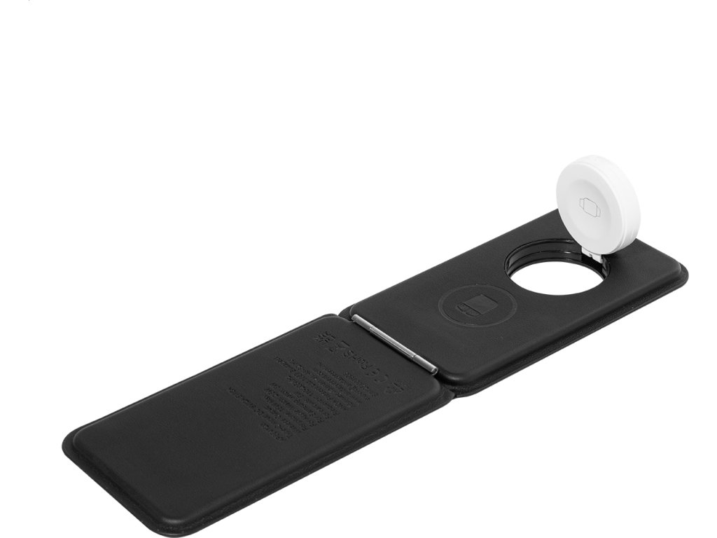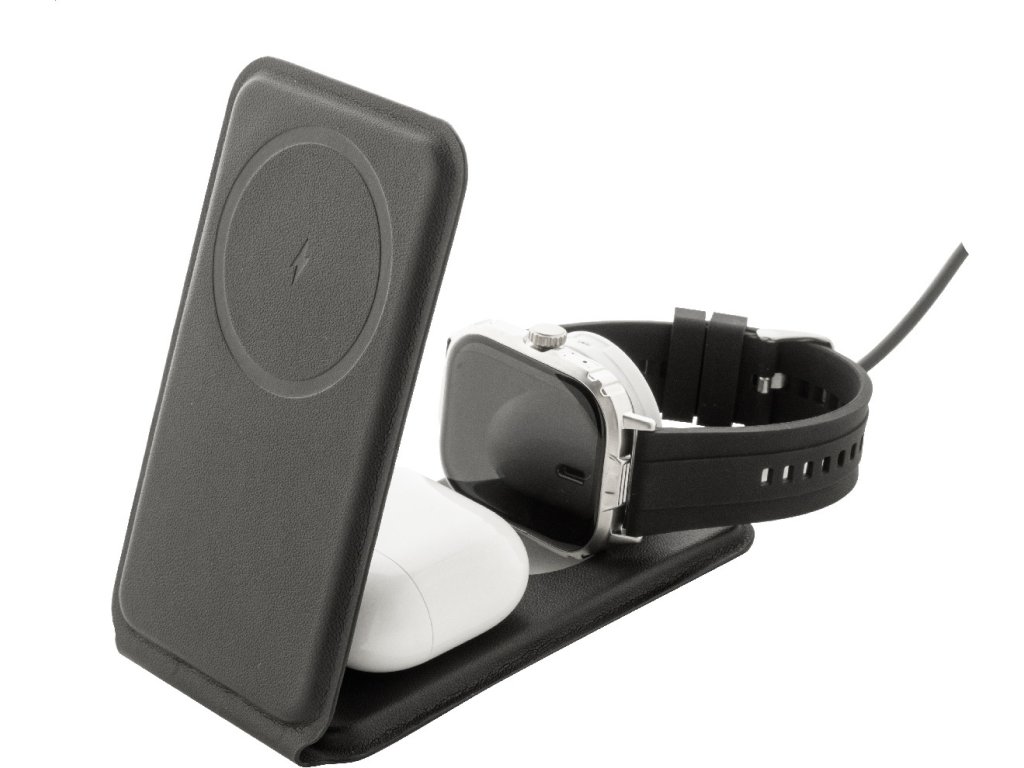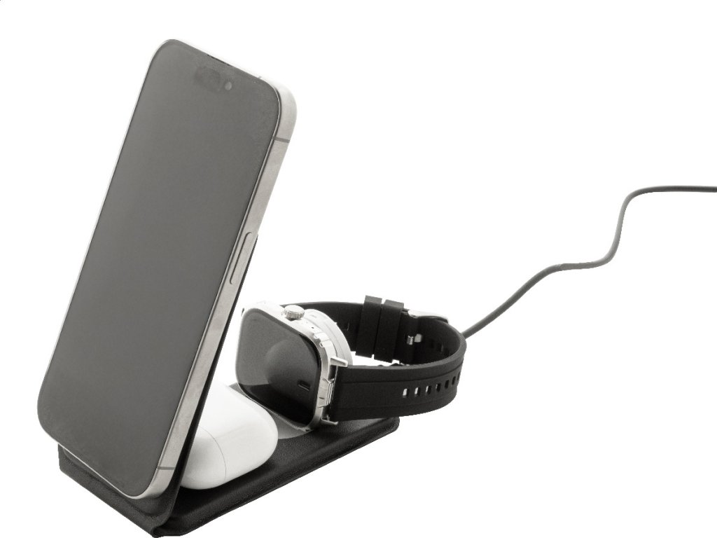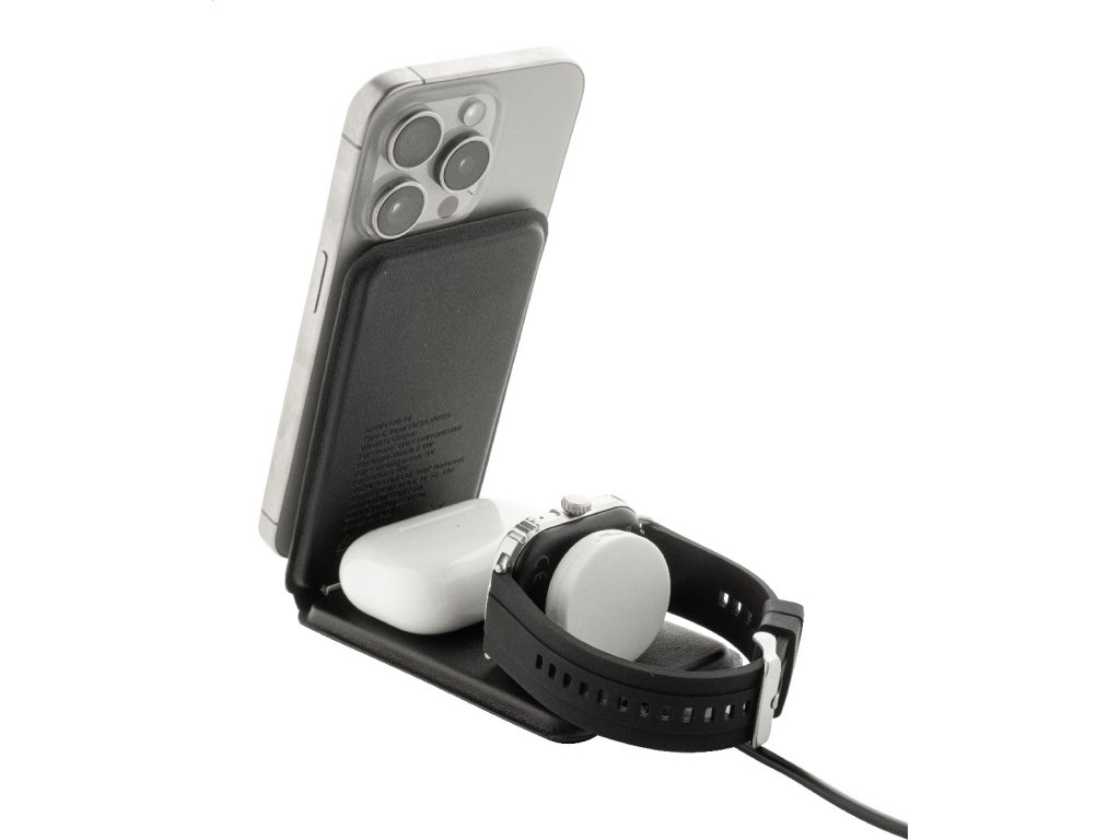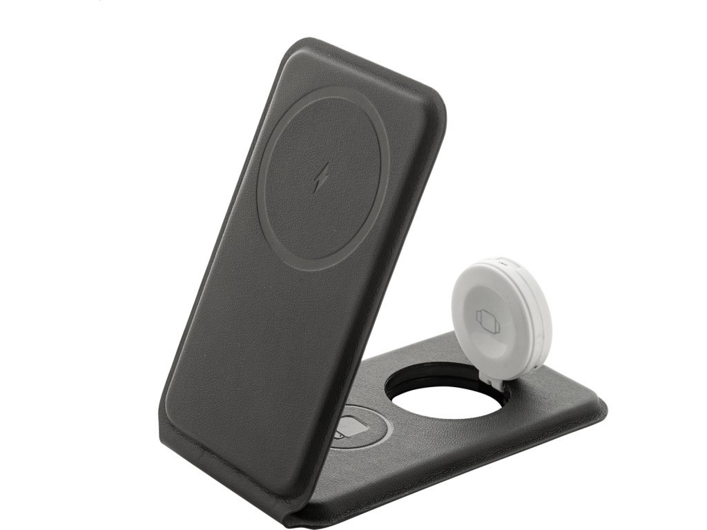 Luxusní skládací držák na mobilní telefon a bezdrátová nabíjecí sada z recyklované PU kůže. S magnetickou bezdrátovou rychlonabíječkou (15 W), bezdrátovou nabíječkou (5 W) pro sluchátka (pouze Apple®) a bezdrátovou nabíječkou (2,5 W) pro chytré hodinky (Apple® a Samsung®). Včetně samolepicího kovového kroužku pro použití magnetické funkce na jakémkoli bezdrátově nabíjecím zařízení. Kompatibilní s iPhone® 12 nebo novějším. Včetně USB nabíjecího kabelu.