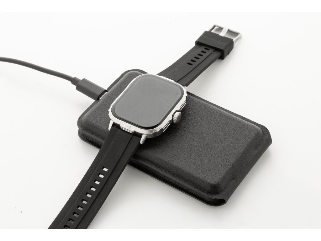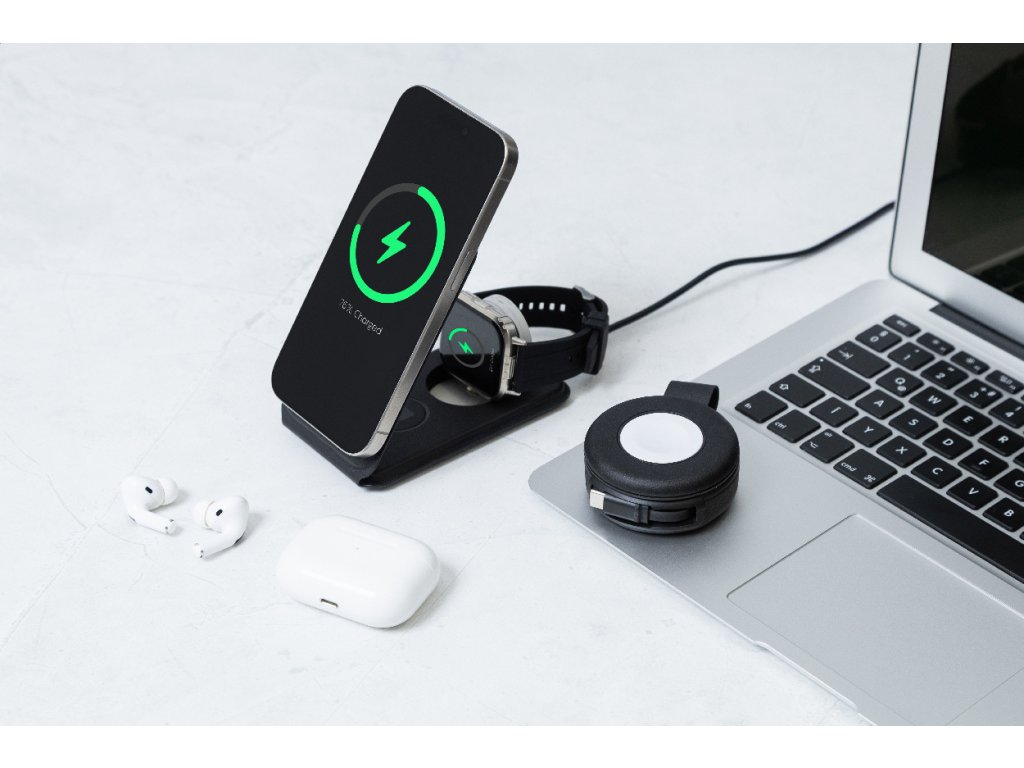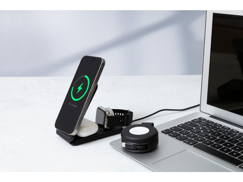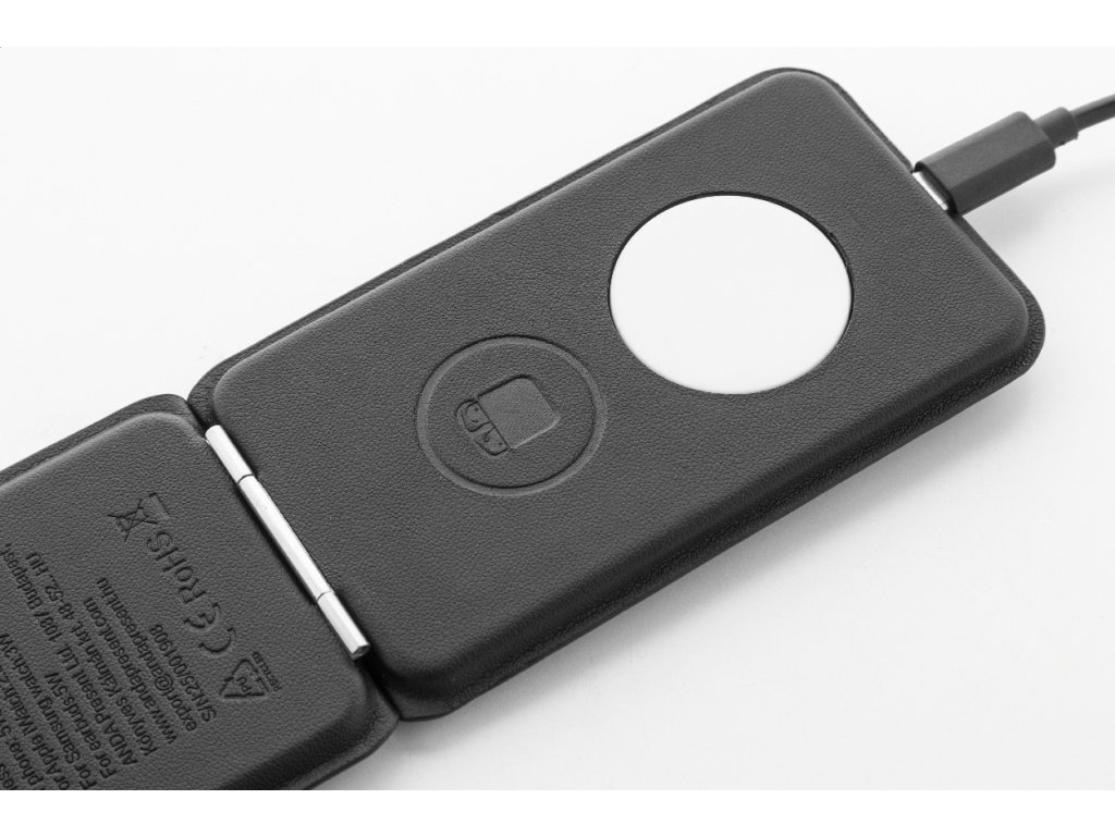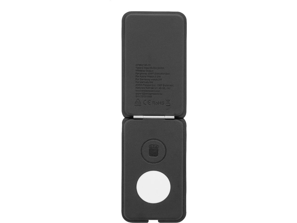 Luxusní skládací držák na mobilní telefon a bezdrátová nabíjecí sada z recyklované PU kůže. S magnetickou bezdrátovou rychlonabíječkou (15 W), bezdrátovou nabíječkou (5 W) pro sluchátka (pouze Apple®) a bezdrátovou nabíječkou (2,5 W) pro chytré hodinky (Apple® a Samsung®). Včetně samolepicího kovového kroužku pro použití magnetické funkce na jakémkoli bezdrátově nabíjecím zařízení. Kompatibilní s iPhone® 12 nebo novějším. Včetně USB nabíjecího kabelu.
