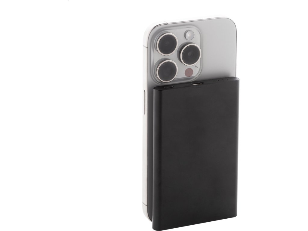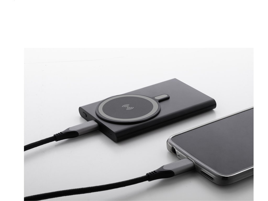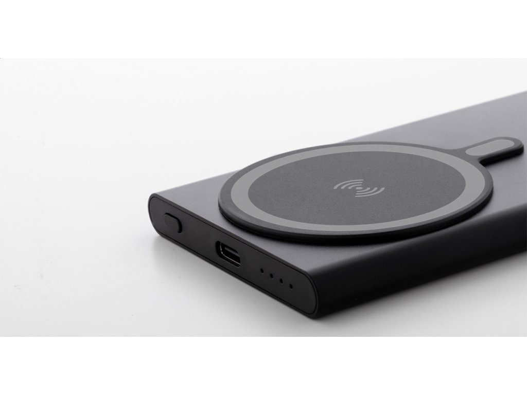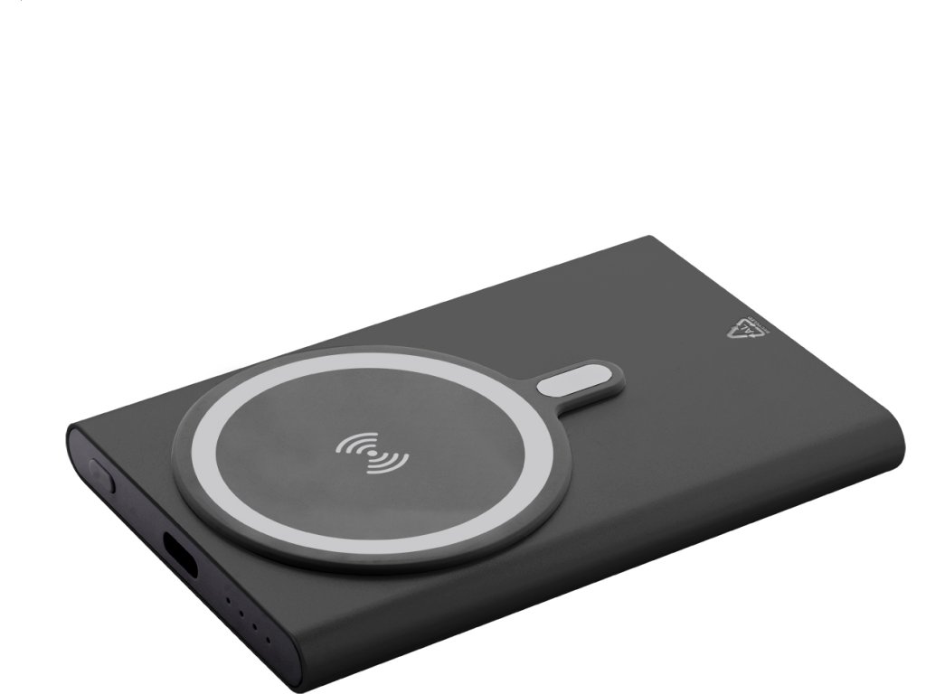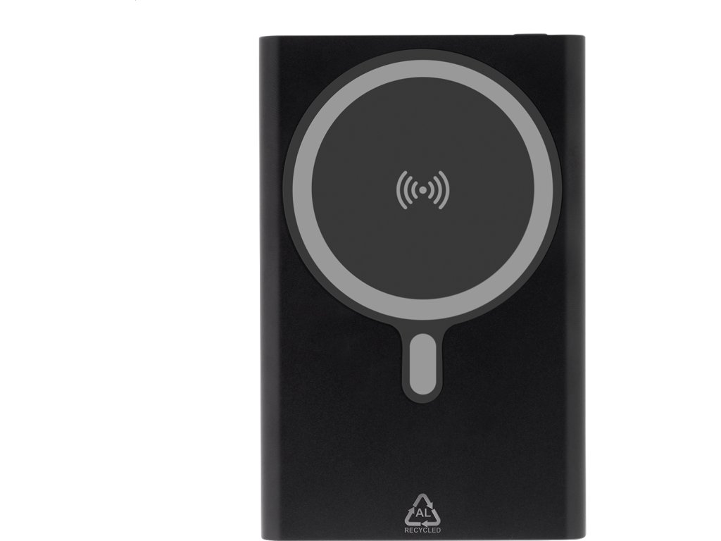 Power banka z recyklovaného hliníku s vestavěnou magnetickou bezdrátovou rychlonabíječkou (15 W) a 5000 mAh baterií. Se vstupem USB-C a portem pro nabíječku. Obsahuje samolepicí kovový kroužek pro použití magnetické funkce na jakémkoli bezdrátovém nabíjecím zařízení. Kompatibilní s iPhone® 12 nebo novějším. USB nabíjecí kabel součástí.