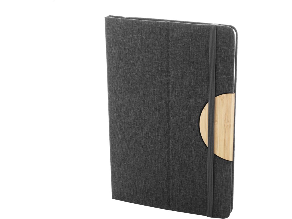 Blok A5 s deskami potaženými polyesterem RPET s bambusovou vložkou a funkcí držáku na mobil. S 80 linkovanými listy z recyklovaného papíru, záložkou a gumičkou.