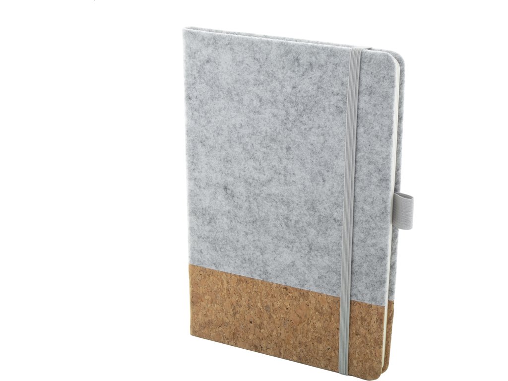 Blok A5 z RPET plsti a přírodního korku s 80 linkovanými listy z recyklovaného papíru. Se záložkou, gumovým páskem a držákem na pero.