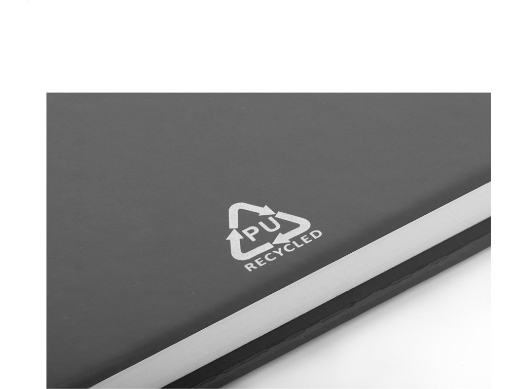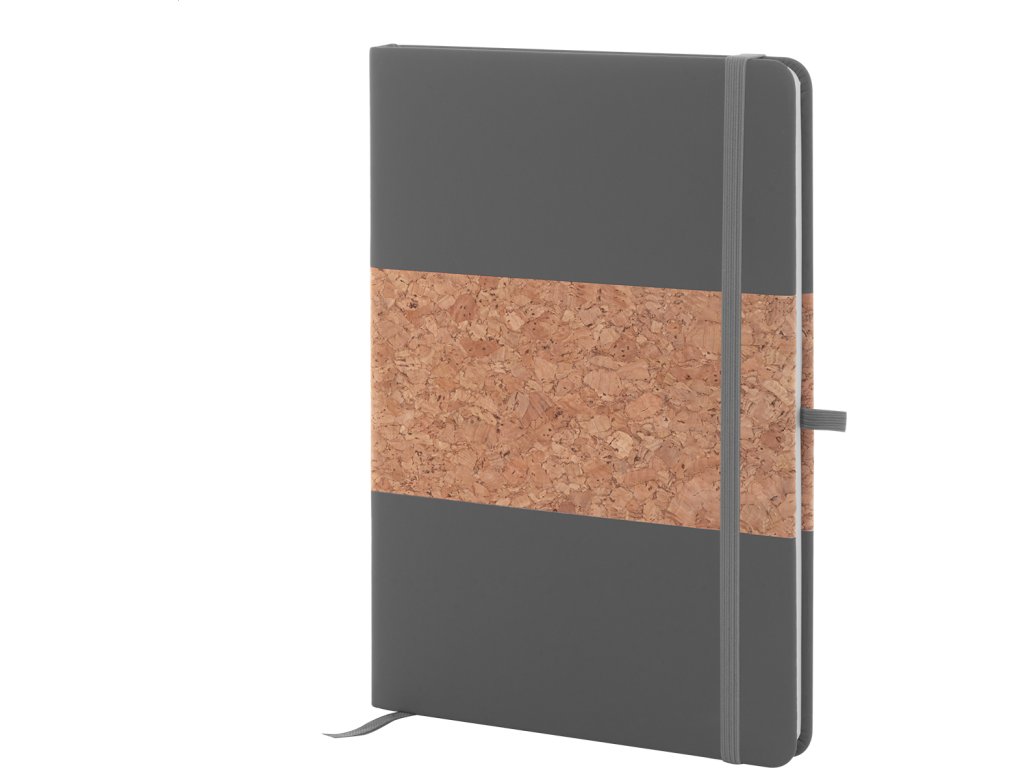 Blok A5 potažený přírodním korkem a recyklovanou PU kůží se záložkou v odpovídající barvě, gumičkou a držákem na pero. S 80 linkovanými listy z recyklovaného papíru.