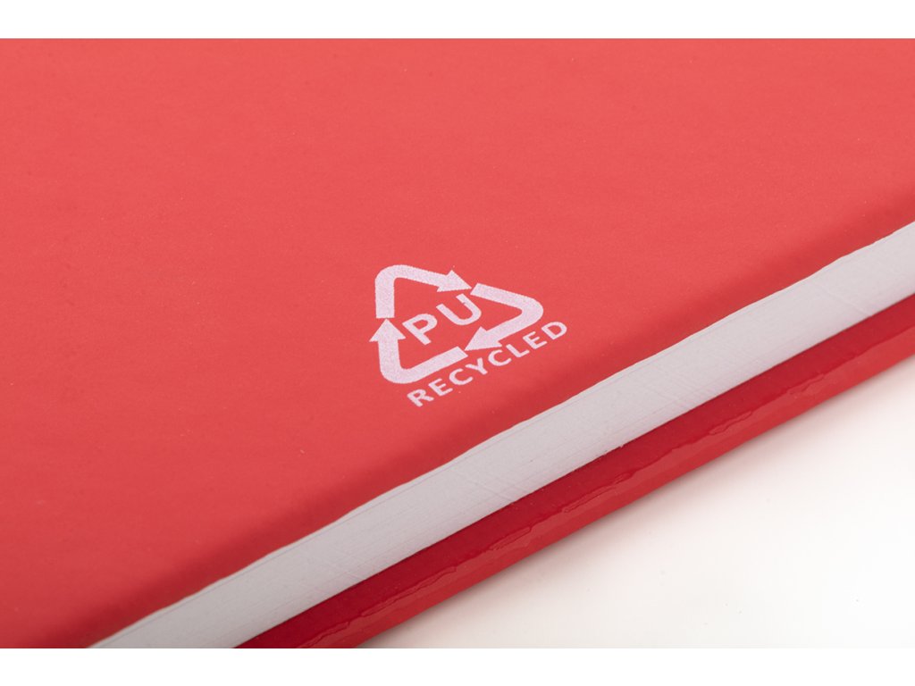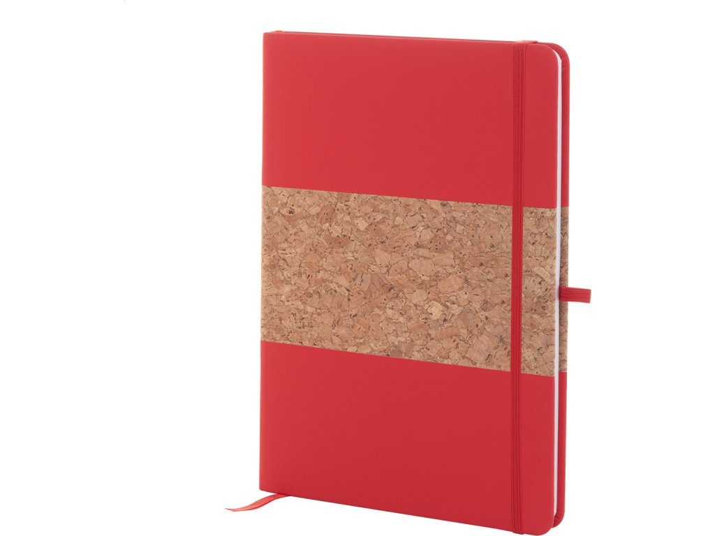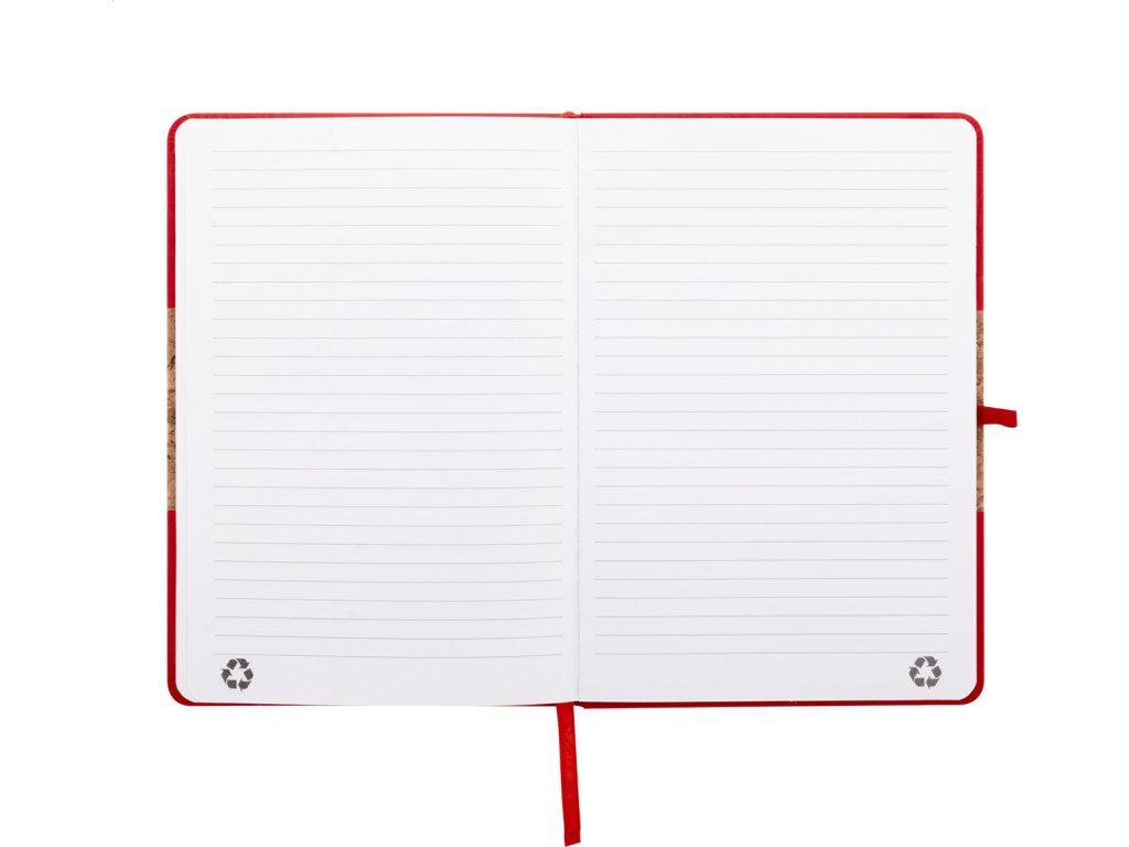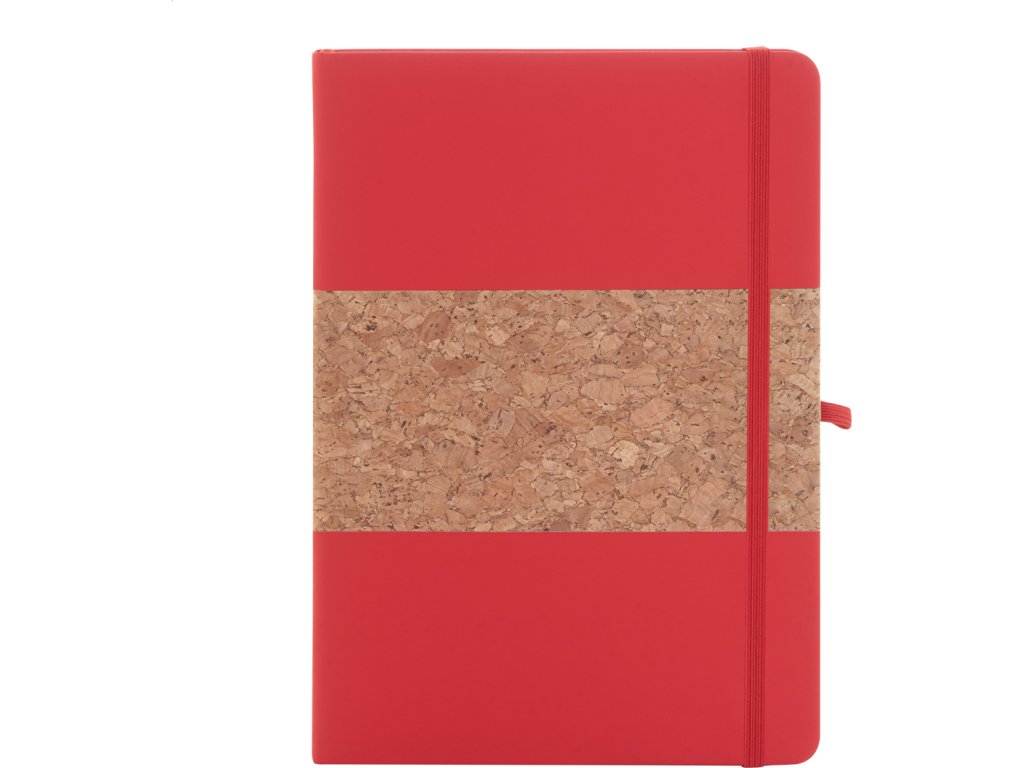 Blok A5 potažený přírodním korkem a recyklovanou PU kůží se záložkou v odpovídající barvě, gumičkou a držákem na pero. S 80 linkovanými listy z recyklovaného papíru.