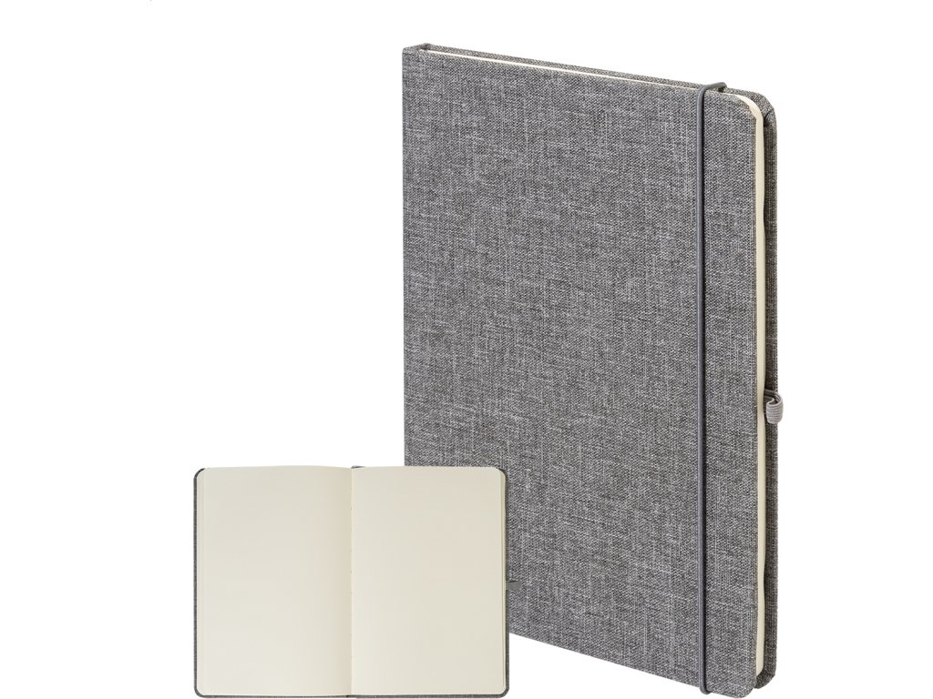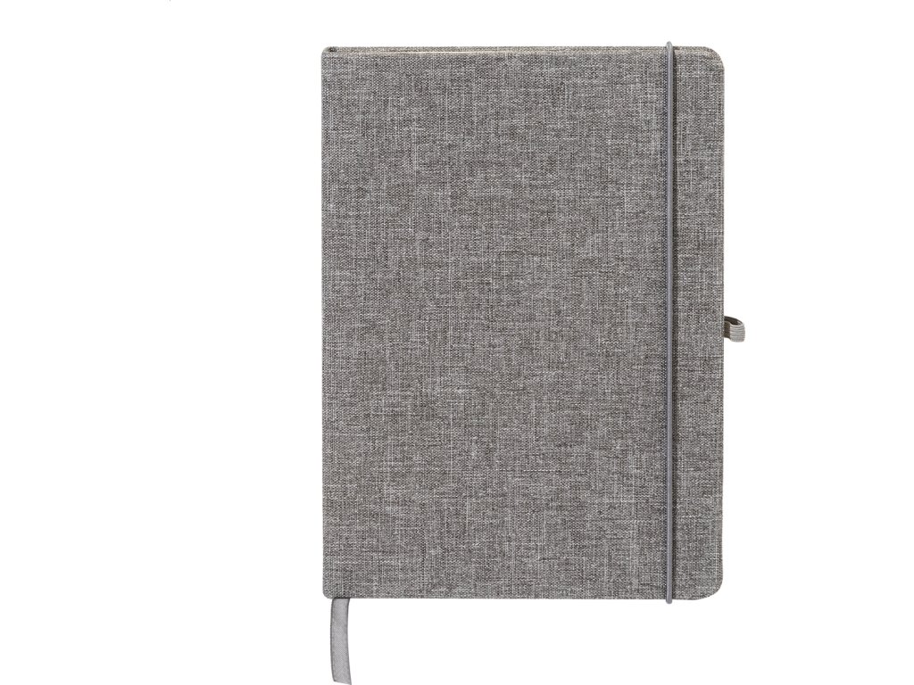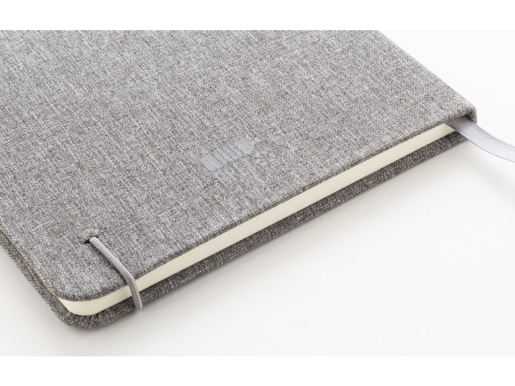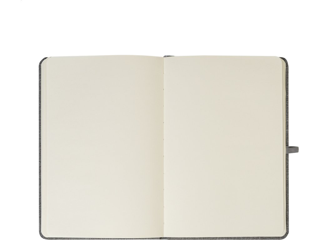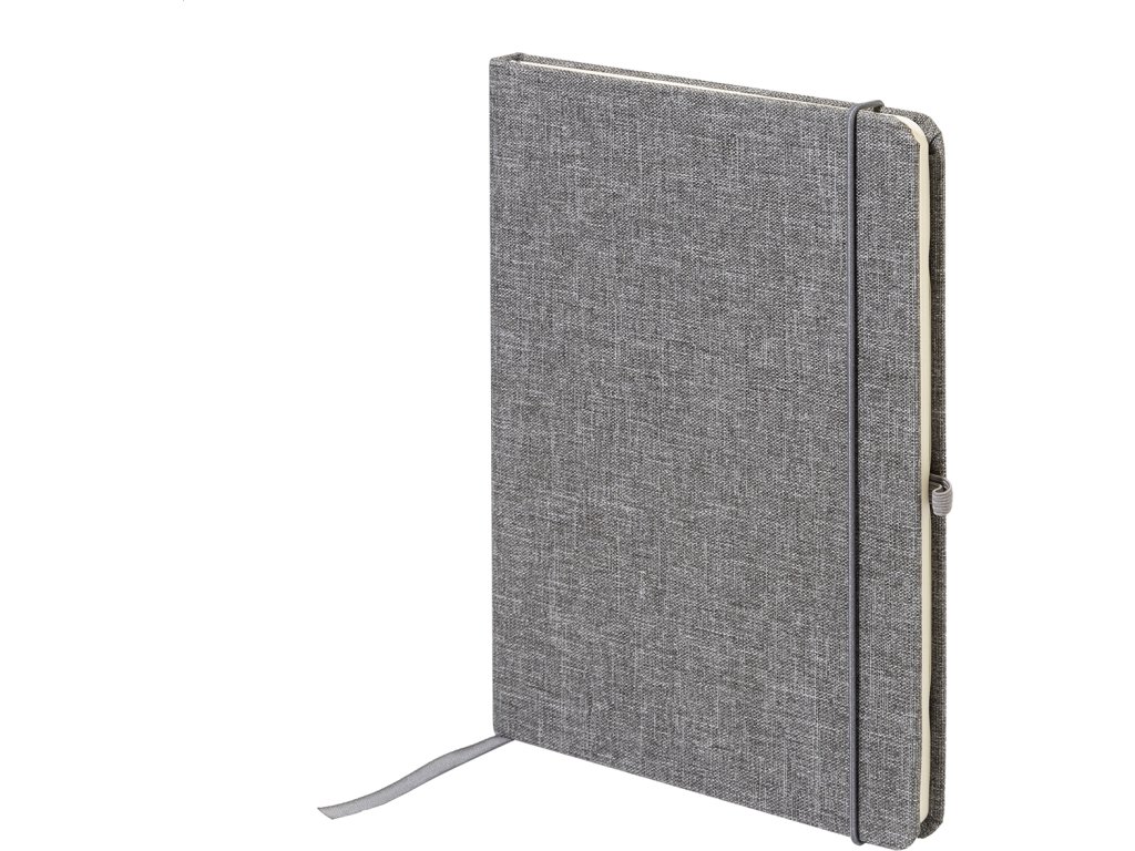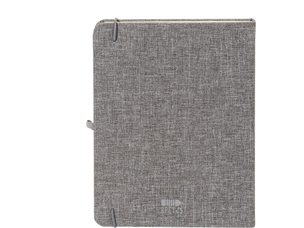 Blok A5 potažený polyesterem 300D RPET s 80 čistými listy. S gumovým páskem, záložkou a držákem na pero.