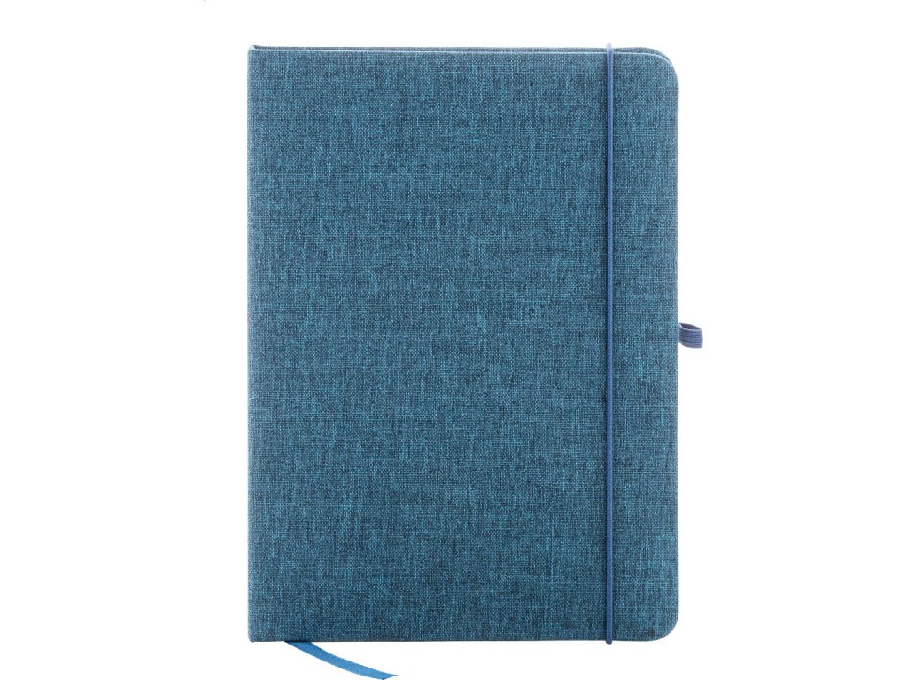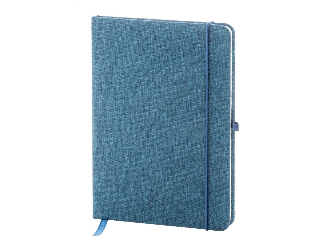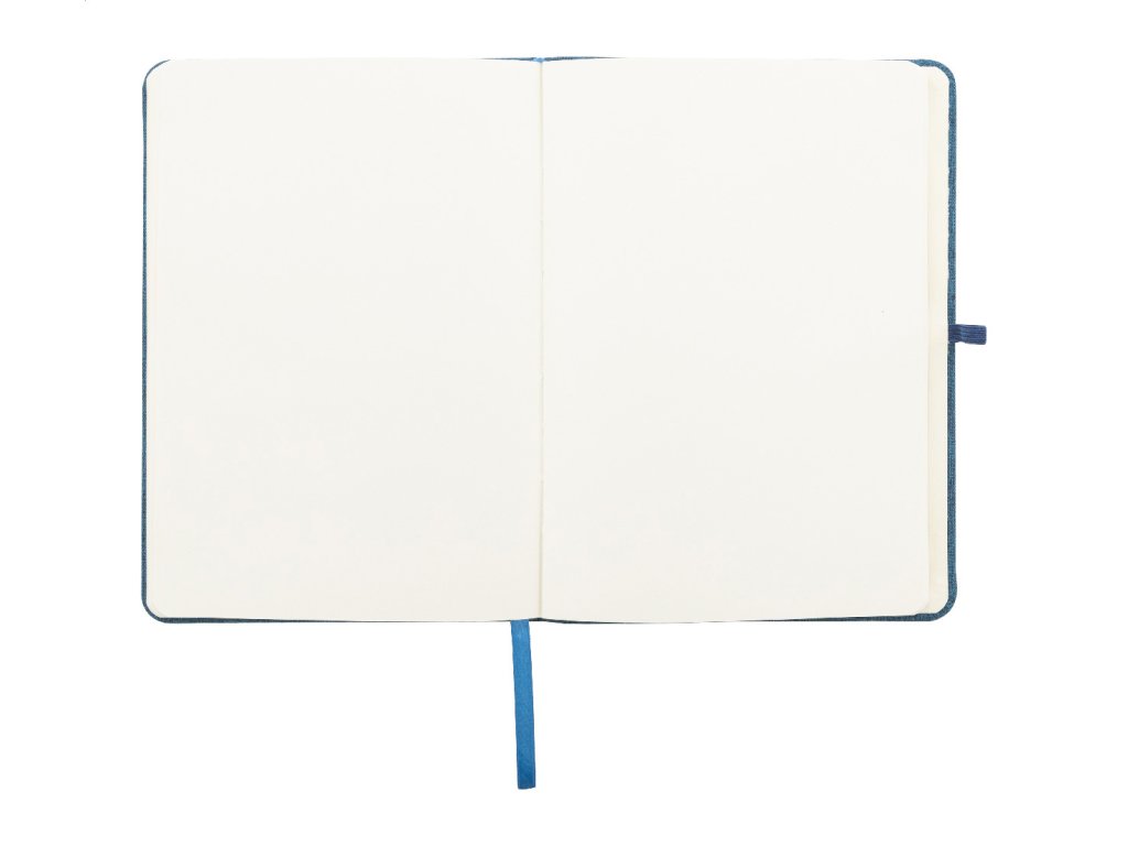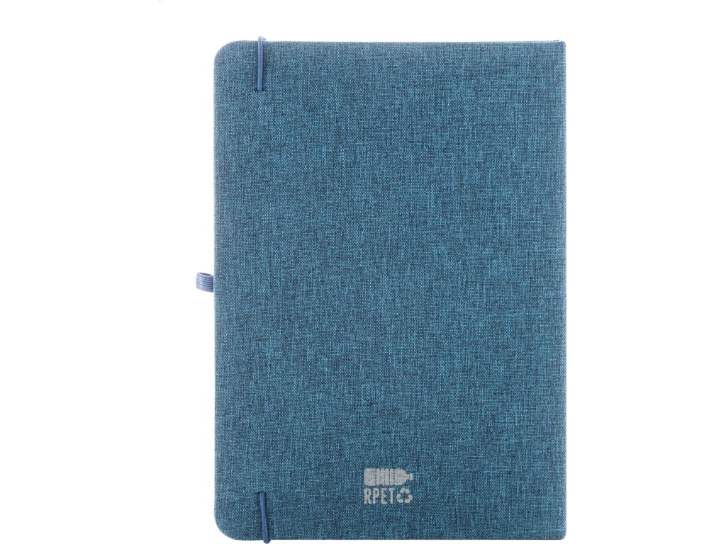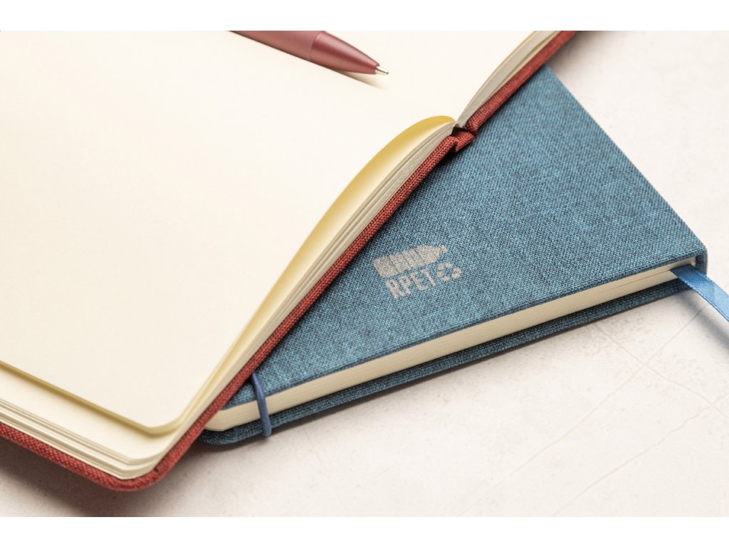 Blok A5 potažený polyesterem 300D RPET s 80 čistými listy. S gumovým páskem, záložkou a držákem na pero.