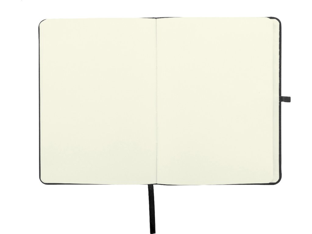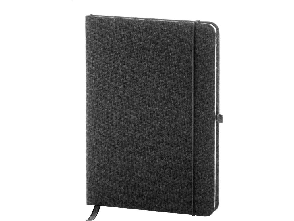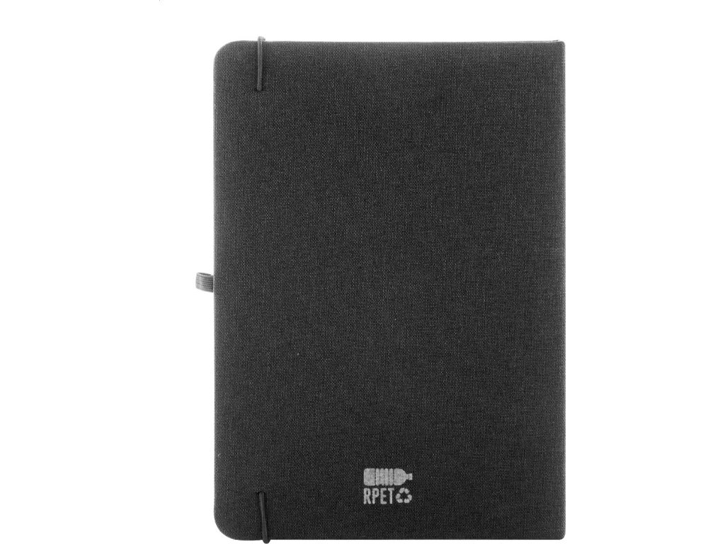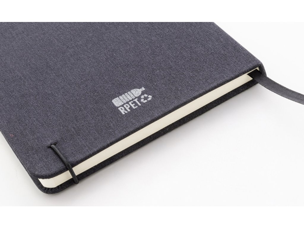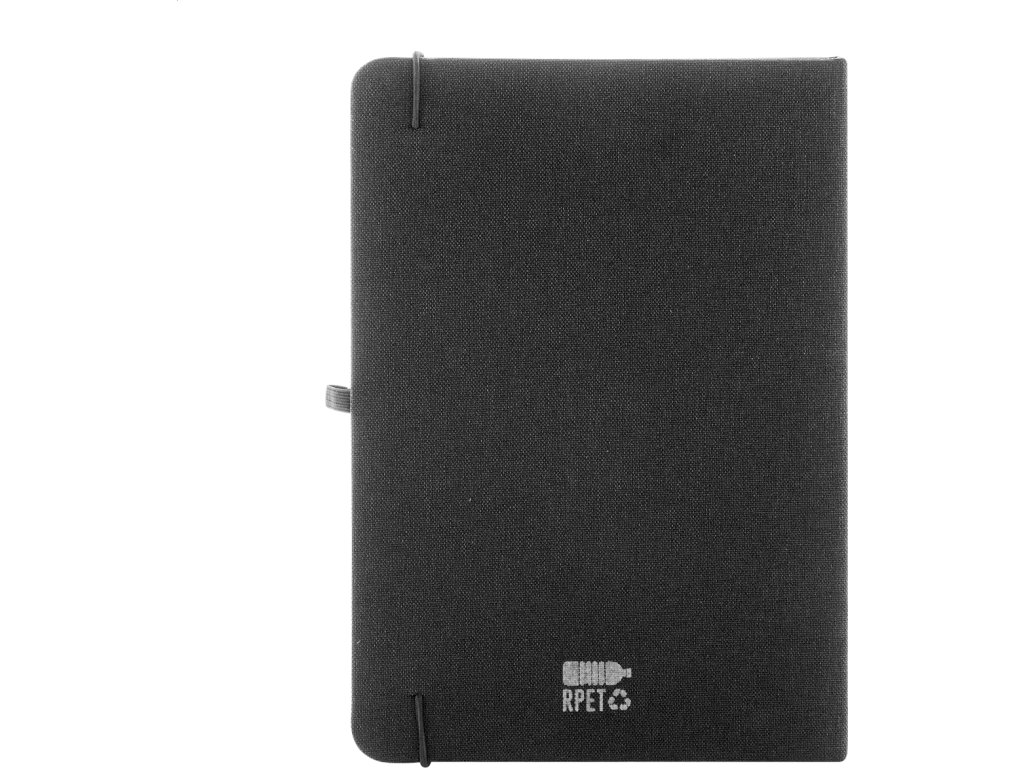 Blok A5 potažený polyesterem 300D RPET s 80 čistými listy. S gumovým páskem, záložkou a držákem na pero.