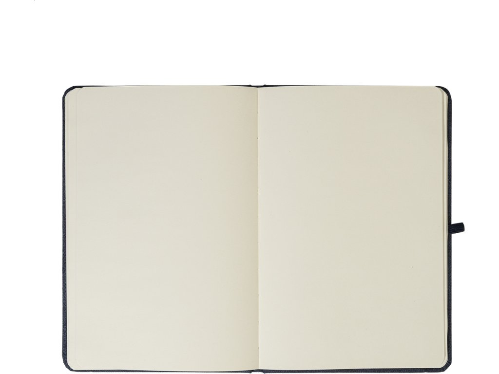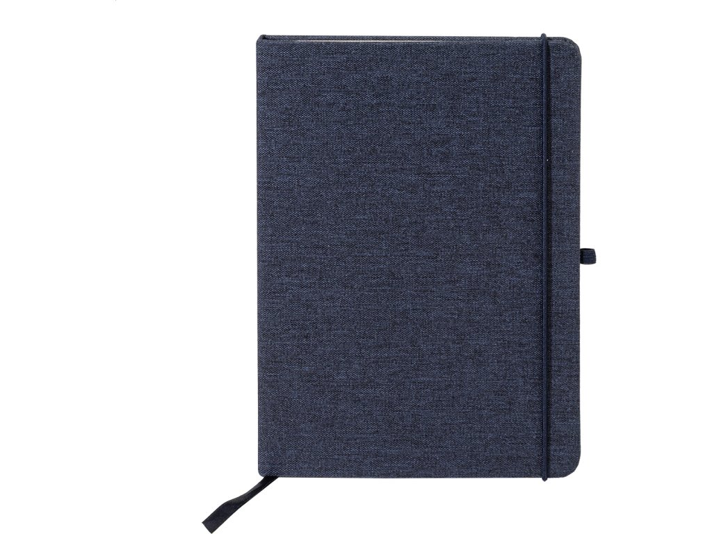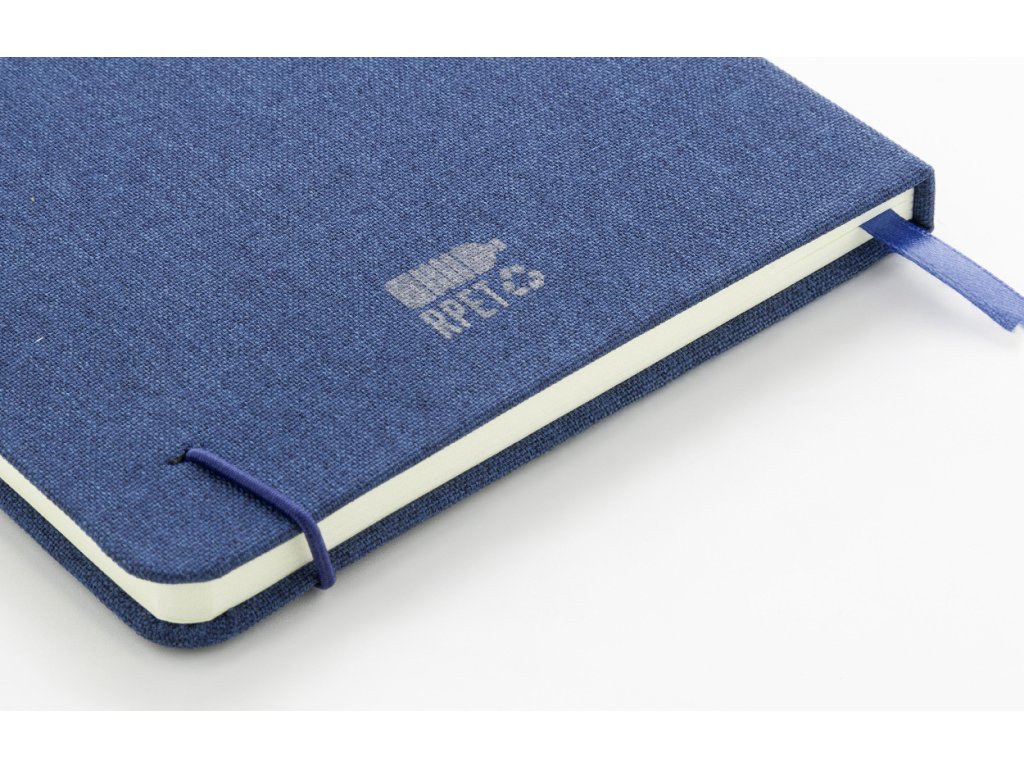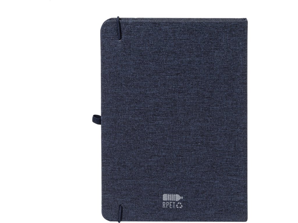 Blok A5 potažený polyesterem 300D RPET s 80 čistými listy. S gumovým páskem, záložkou a držákem na pero.