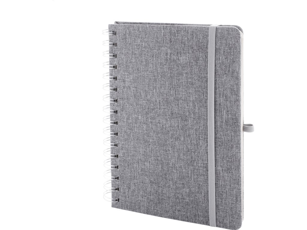 Spirálový blok A5 s deskami potaženými polyesterem RPET s plastovým držákem na mobil a tablet z pšeničné slámy. Se 70 linkovanými listy z recyklovaného kraftového papíru, gumičkou a držákem na pero.