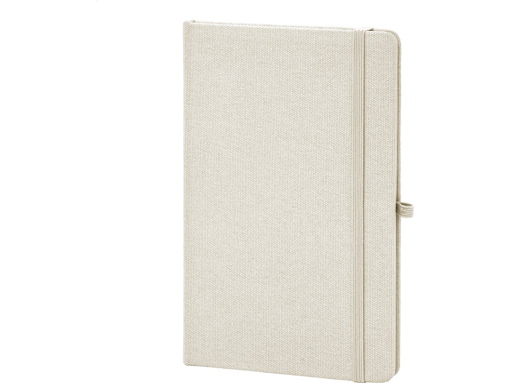 Blok potažený recyklovanou bavlnou s 80 linkovanými listy z recyklovaného papíru. Se záložkou v odpovídající barvě, gumičkou a držákem na pero. Velikost A5.