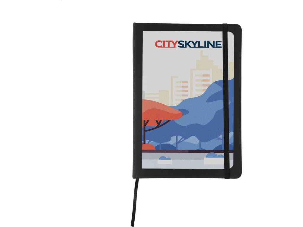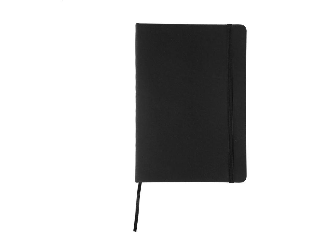 Poznámkový blok se 100 listy, záložkou a gumičkou.
