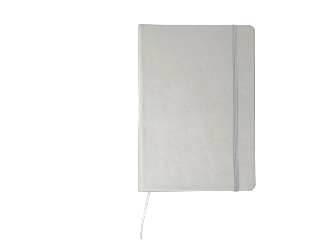 Poznámkový blok se 100 listy, záložkou a gumičkou.