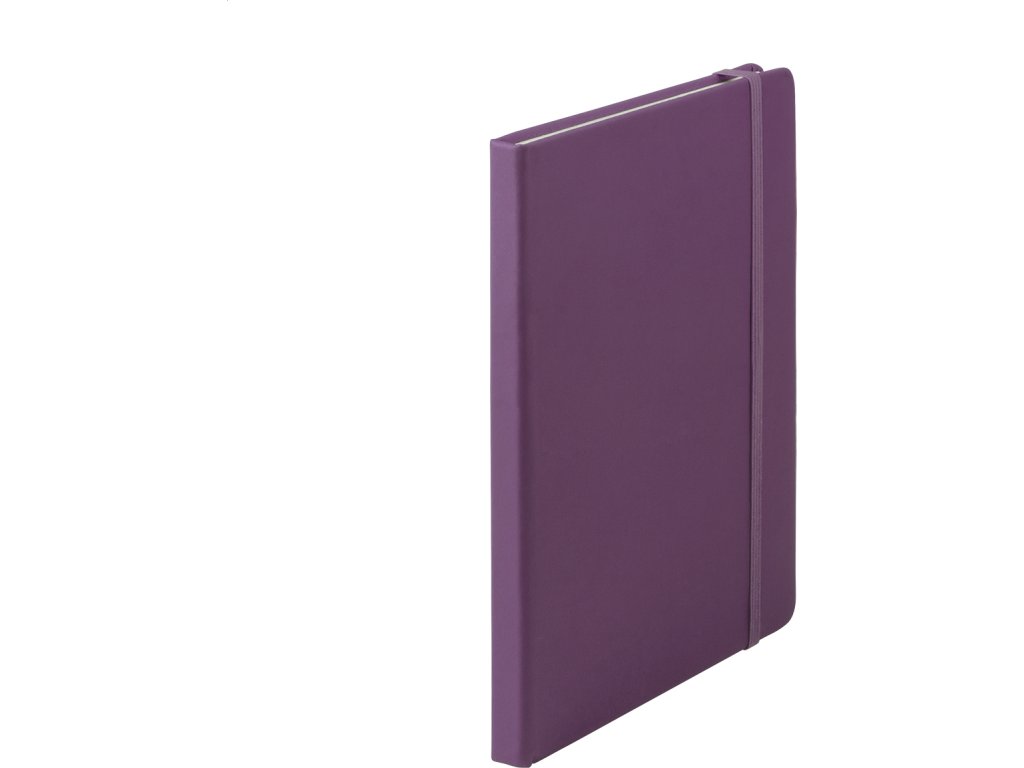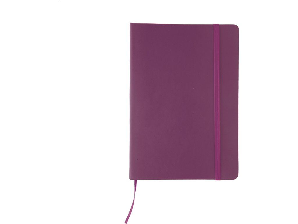 Poznámkový blok se 100 listy, záložkou a gumičkou.