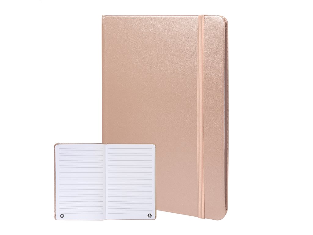Blok A5 s potahem z recyklované PU kůže s metalickou úpravou se 100 linkovanými listy z recyklovaného papíru. S barevnou záložkou a gumičkou.