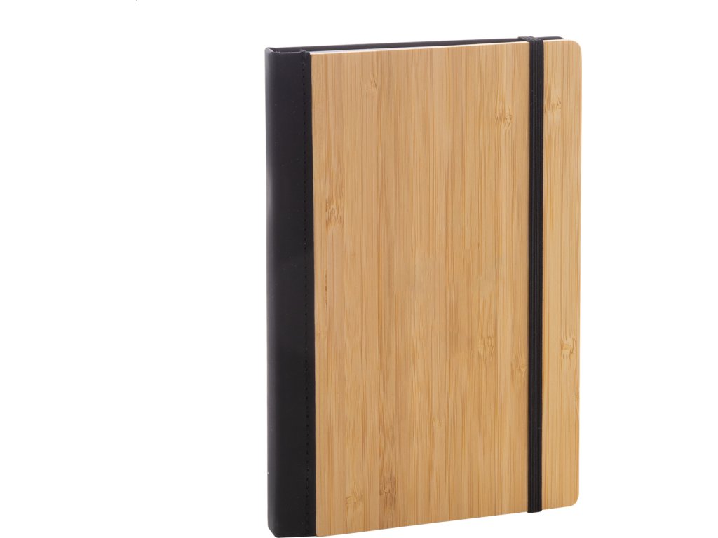 Blok A5 potažený bambusem a PU kůží s 80 linkovanými listy z recyklovaného papíru, záložkou a gumičkou.