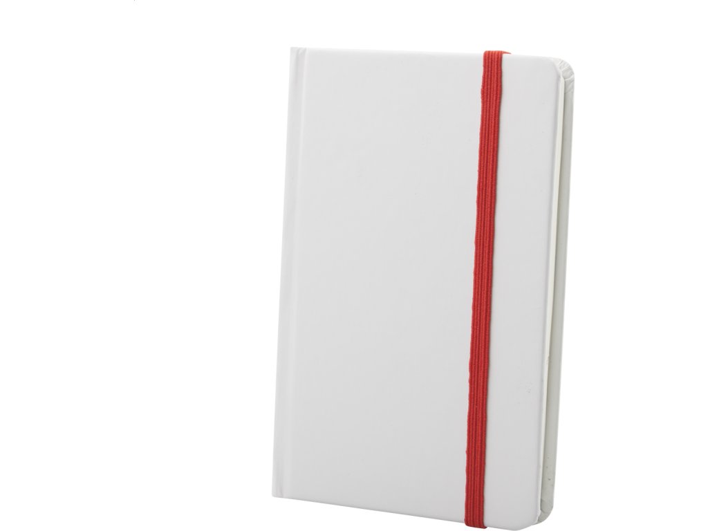 Poznámkový blok s bílými deskami, 80 čistými listy a barevnou gumičkou. Velikost A6.