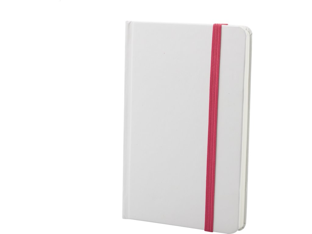 Poznámkový blok s bílými deskami, 80 čistými listy a barevnou gumičkou. Velikost A6.