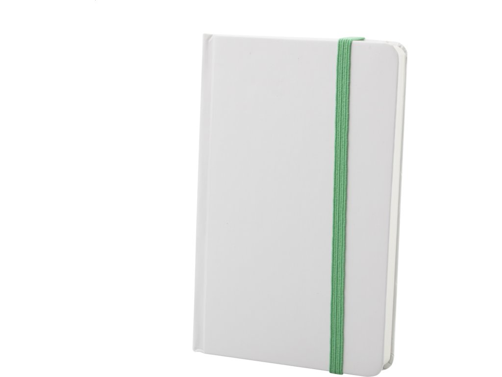 Poznámkový blok s bílými deskami, 80 čistými listy a barevnou gumičkou. Velikost A6.