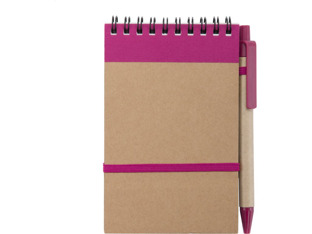 Blok ve spirále z recyklovaného papíru se 70 linkovanými listy a kuličkovým perem z recyklovaného papíru s modrou náplní. Velikost A6.