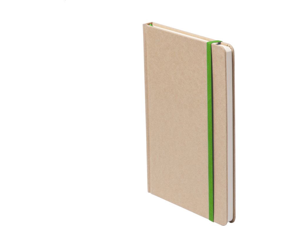 Blok s deskami potaženými recyklovaným kartonem se 100 čistými listy, barevnou záložkou a gumičkou.