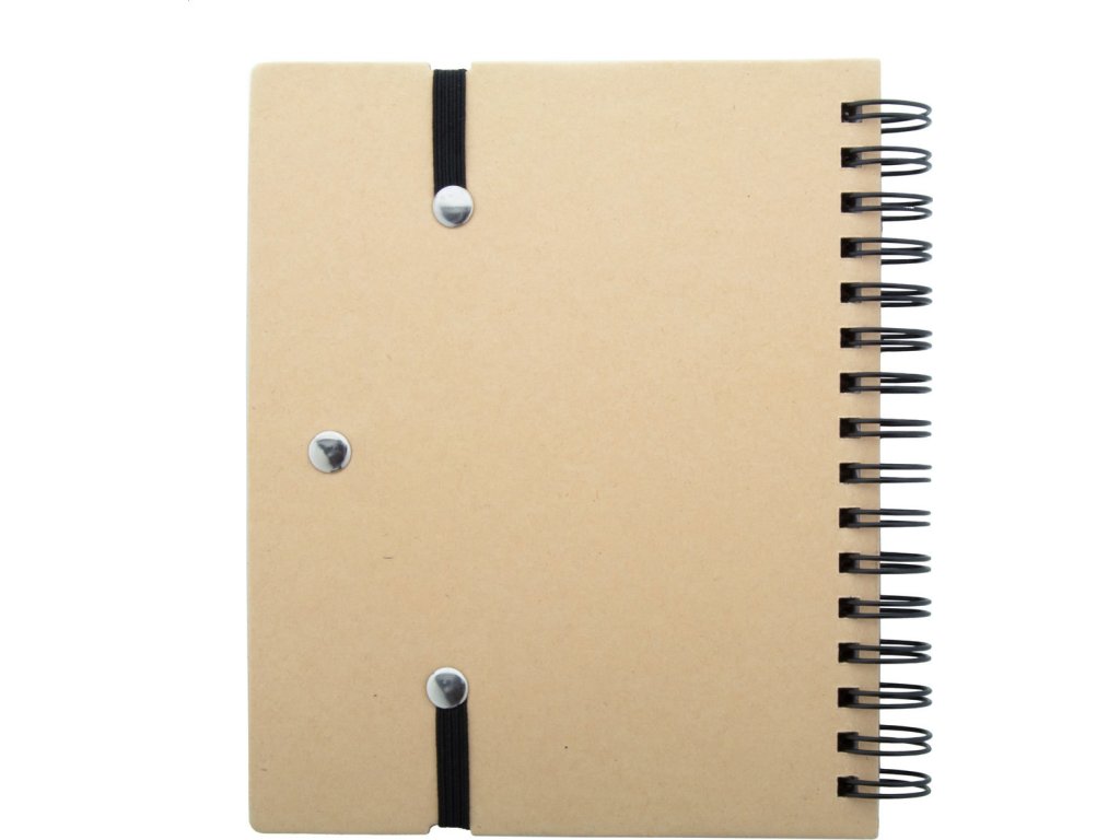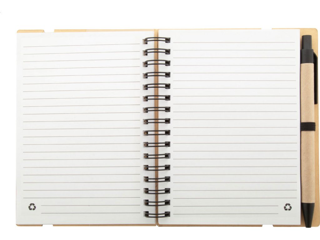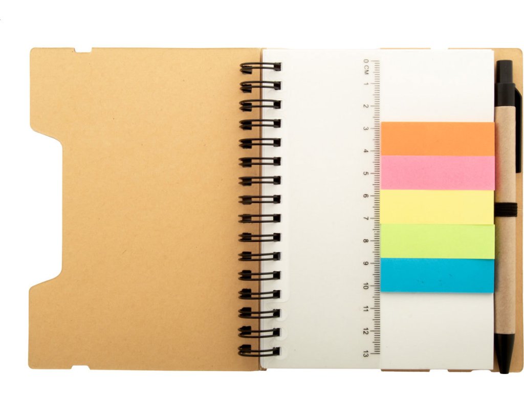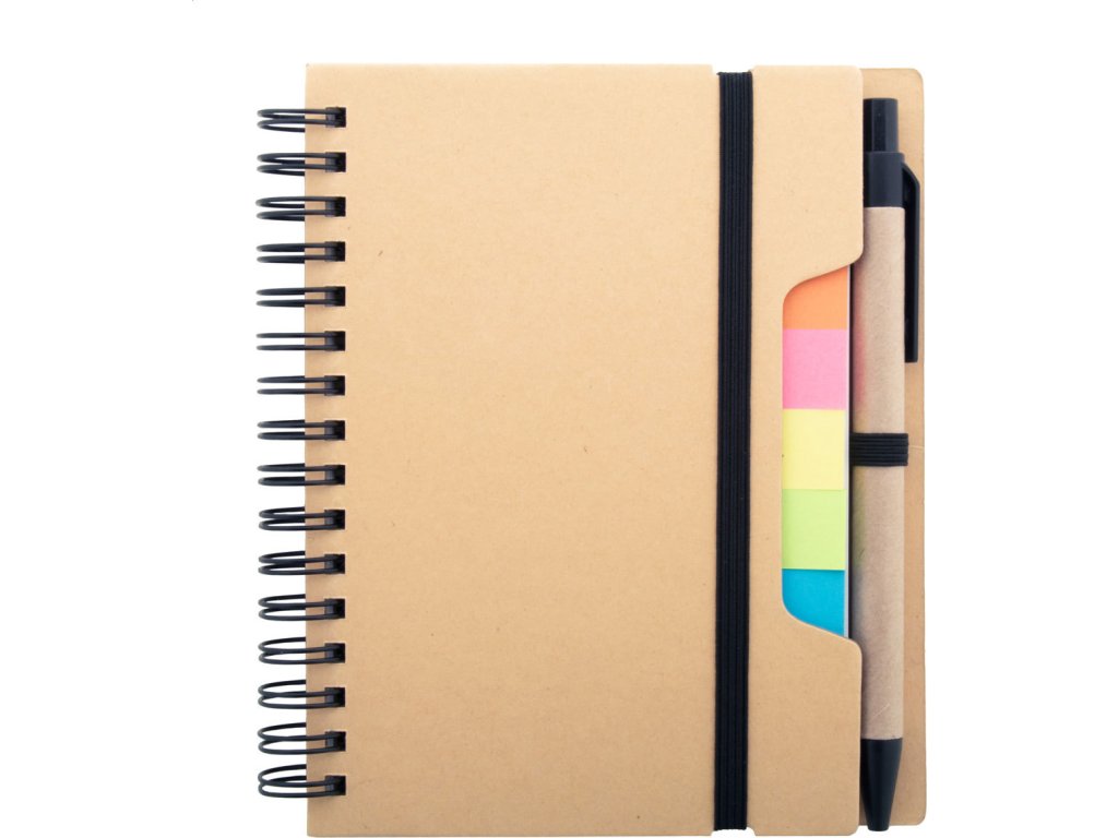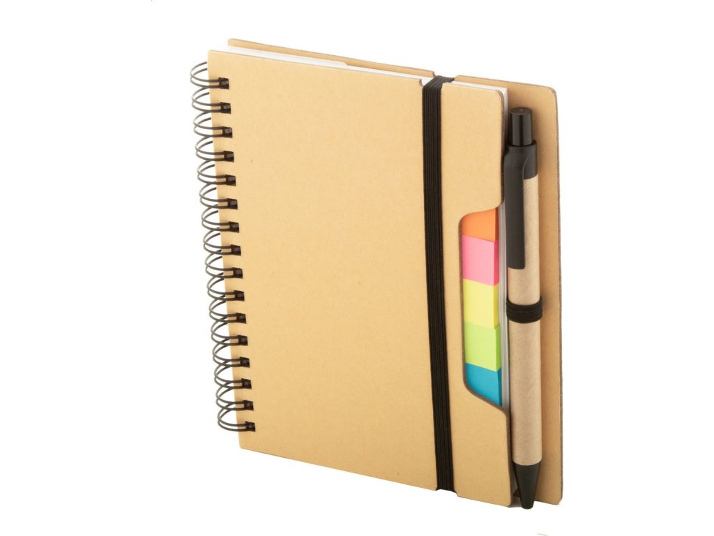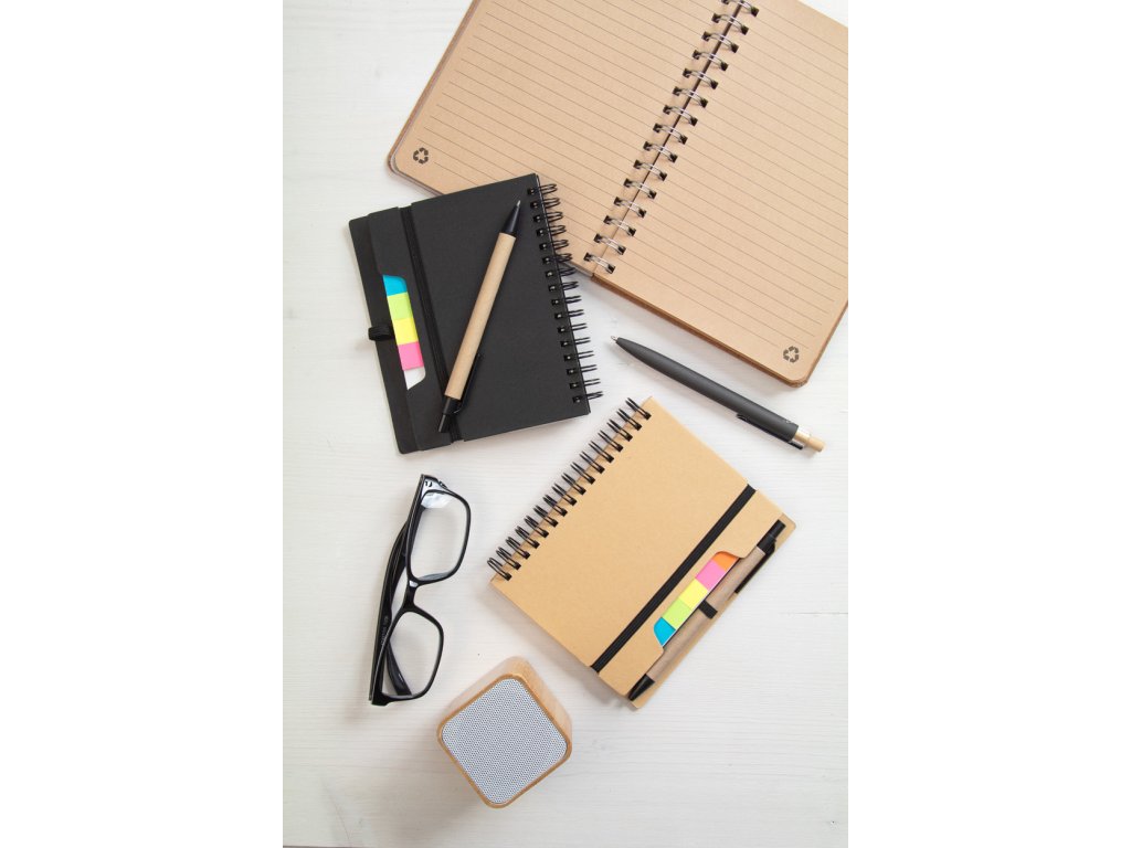 Spirálový blok A6 z recyklovaného papíru se 70 linkovanými listy a 125 popisovači stránek (v 5 různých barvách). S gumovým páskem a držákem na pero. Včetně kuličkového pera z recyklovaného papíru s modrou náplní.