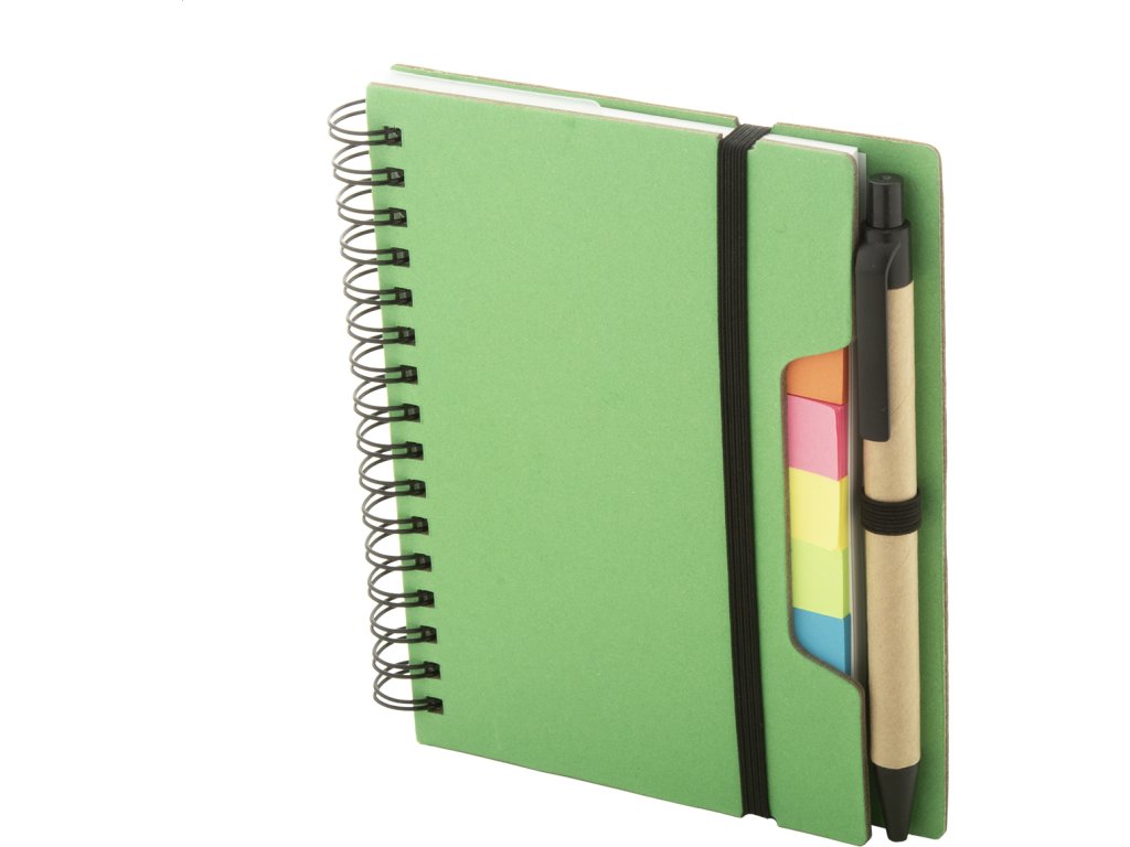 Spirálový blok A6 z recyklovaného papíru se 70 linkovanými listy a 125 popisovači stránek (v 5 různých barvách). S gumovým páskem a držákem na pero. Včetně kuličkového pera z recyklovaného papíru s modrou náplní.
