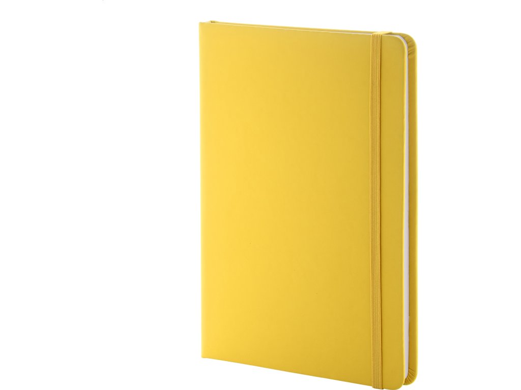 Blok A5 z recyklované PU kůže se 100 čistými listy z recyklovaného papíru. Se záložkou v odpovídající barvě a gumičkou.