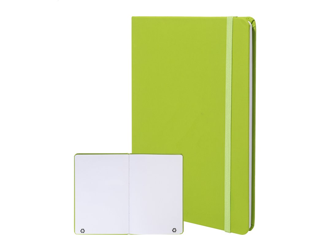 Blok A5 z recyklované PU kůže se 100 čistými listy z recyklovaného papíru. Se záložkou v odpovídající barvě a gumičkou.
