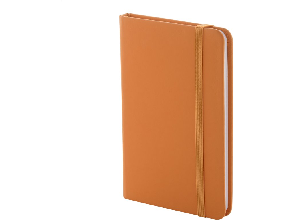 Blok A6 z recyklované PU kůže se 100 čistými listy z recyklovaného papíru. Se záložkou v odpovídající barvě a gumičkou.