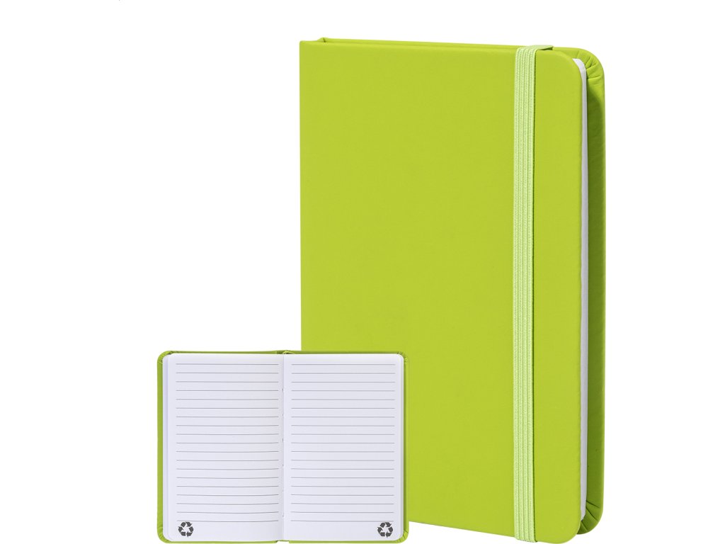 Blok potažený recyklovanou PU kůží se 100 linkovanými listy z recyklovaného papíru. Se záložkou v odpovídající barvě a gumičkou. Velikost A6.