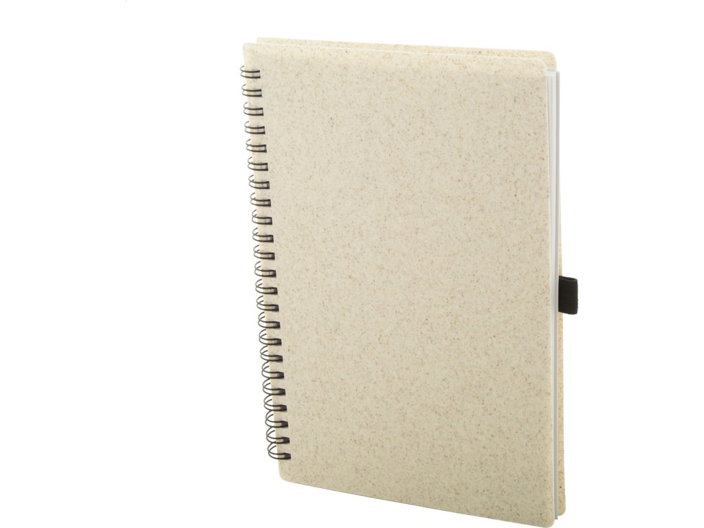 Ekologický spirálový blok A5 potažený plastem z pšeničné slámy se 70 linkovanými listy z recyklovaného papíru a držákem na pero.