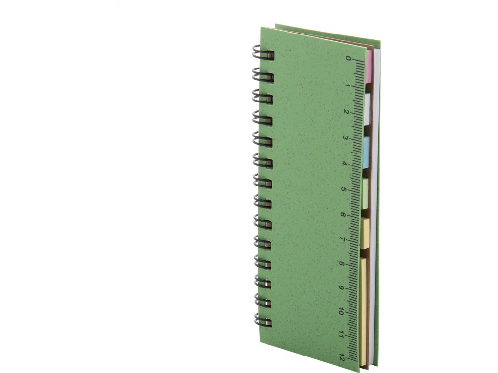 Ekologický spirálový blok potažený plastem z pšeničné slámy se 40 linkovanými listy z recyklovaného papíru, 25 lepícími papírky a 125 popisovači stránek (v 5 různých barvách). S pravítkem 12 cm na deskách.