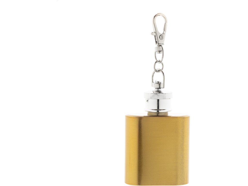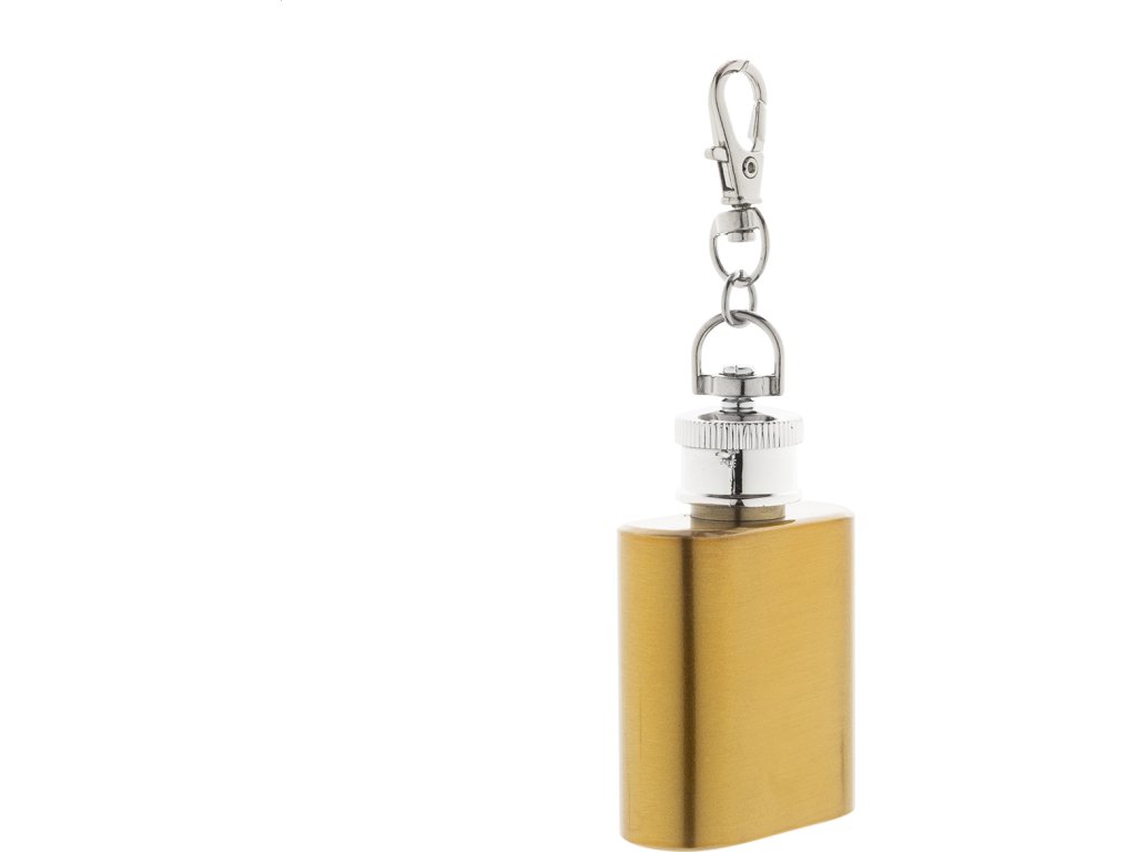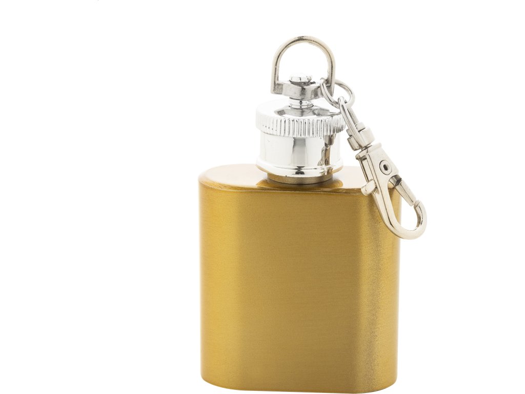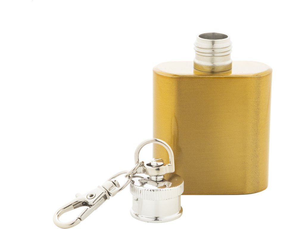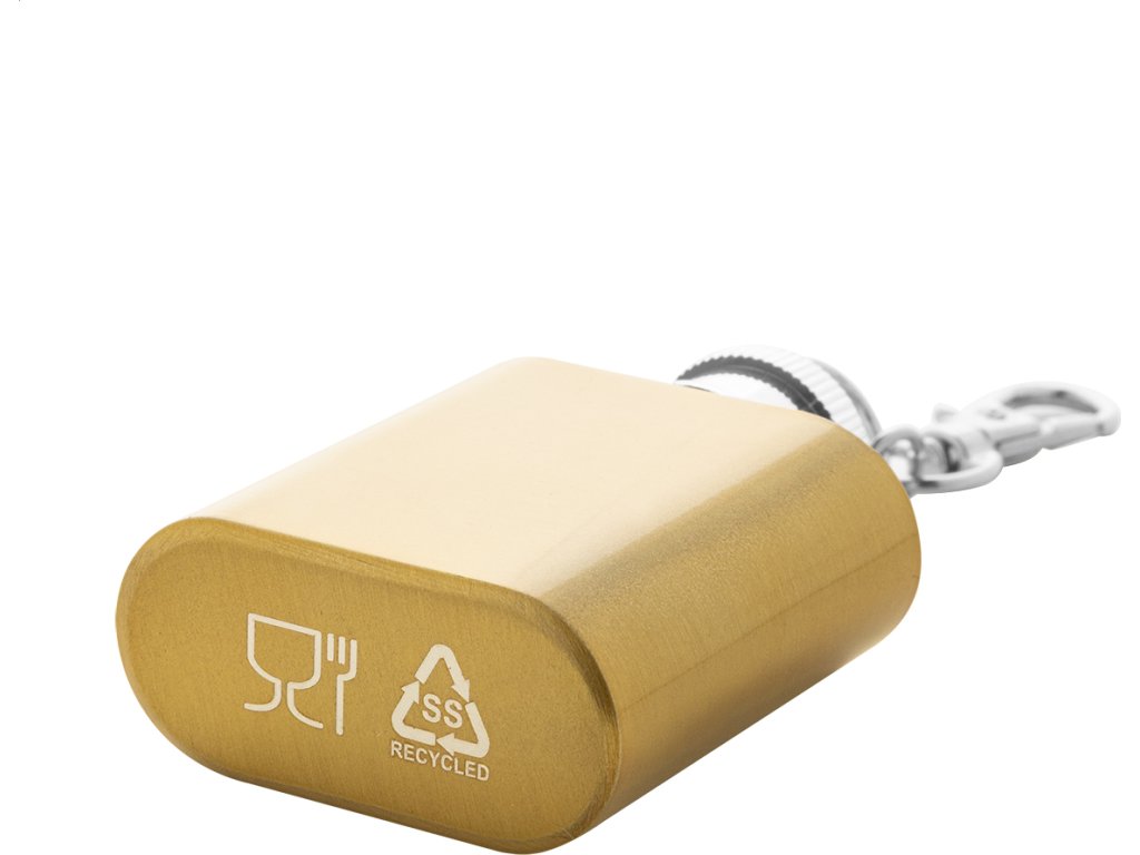 Mini butylka z recyklované nerezové oceli s lesklým kovovým povrchem a karabinou na klíče. 30 ml.